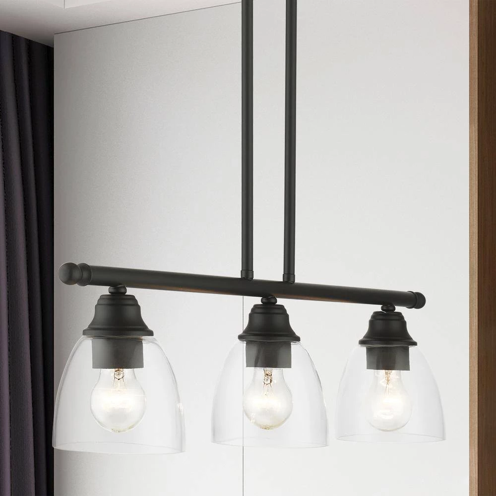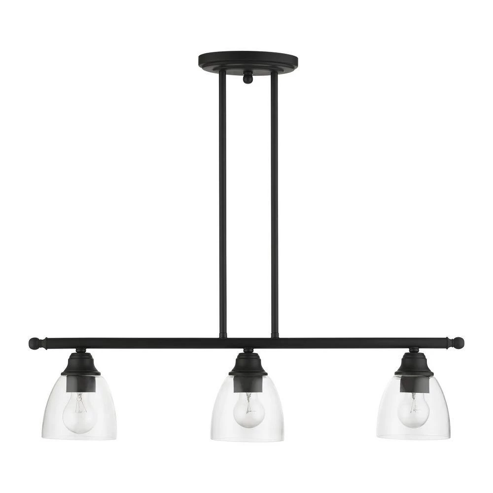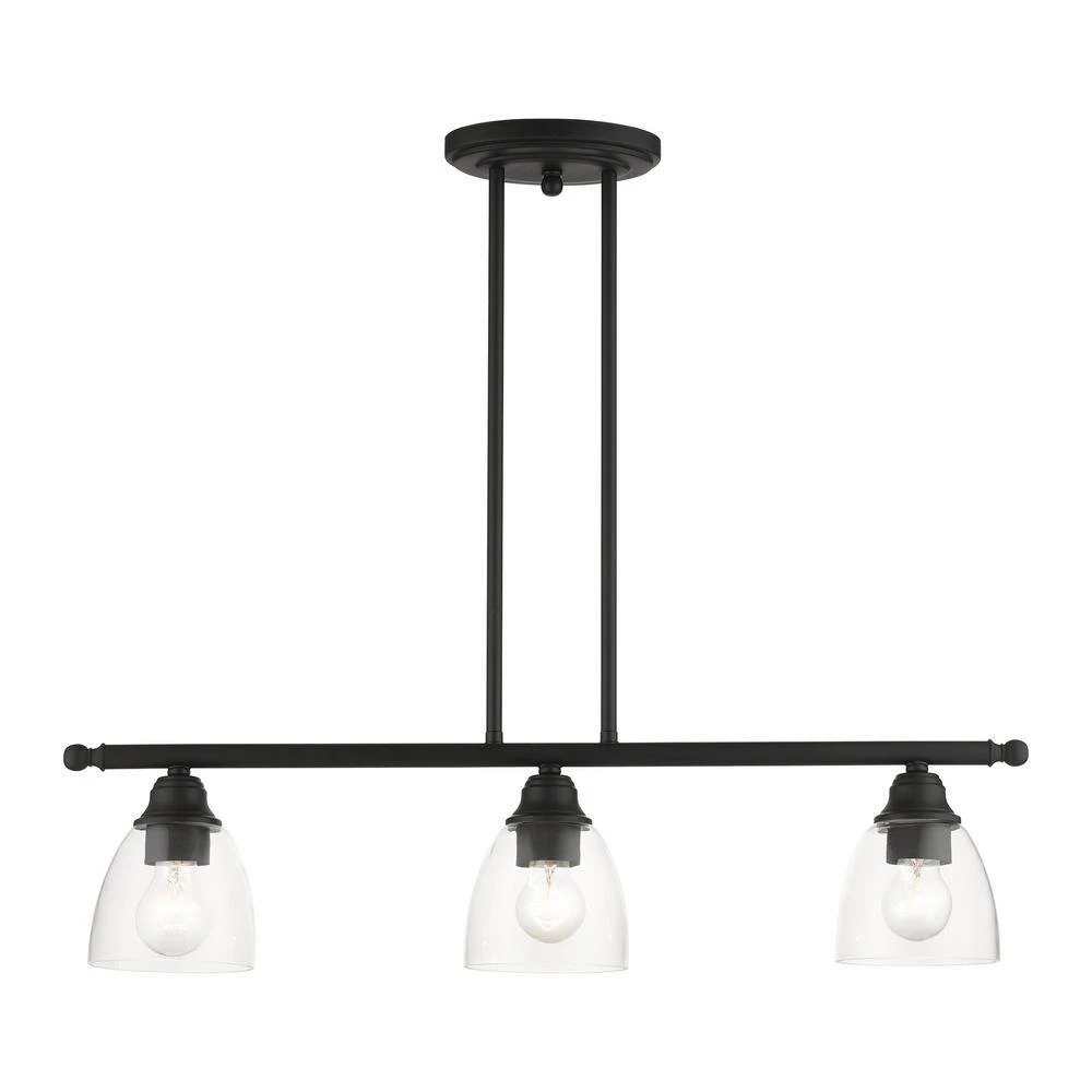 Livex Lighting is well known for quality, style and value. Whether it’s style or practical lighting, this linear chandelier is the perfect addition to your kitchen island or dining room. This 3-light island fixture from the Montgomery Collection features clear hand-blown glass shades and is shown in a black finish. The clean graceful lines of this piece complement the shade, creating a transitional look that works well in most decors. Classic elegance combines with contemporary appeal to enhance any home in style. This well-rounded fixture is sure to satisfy your lighting needs.