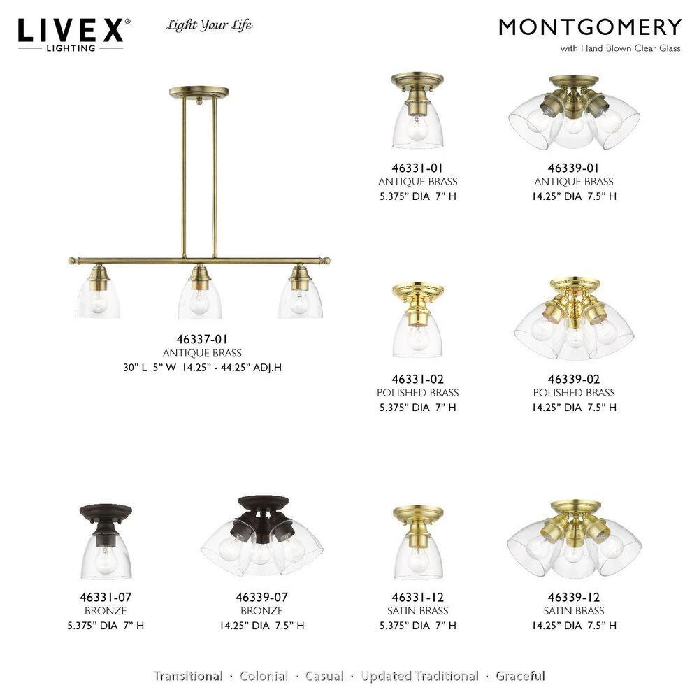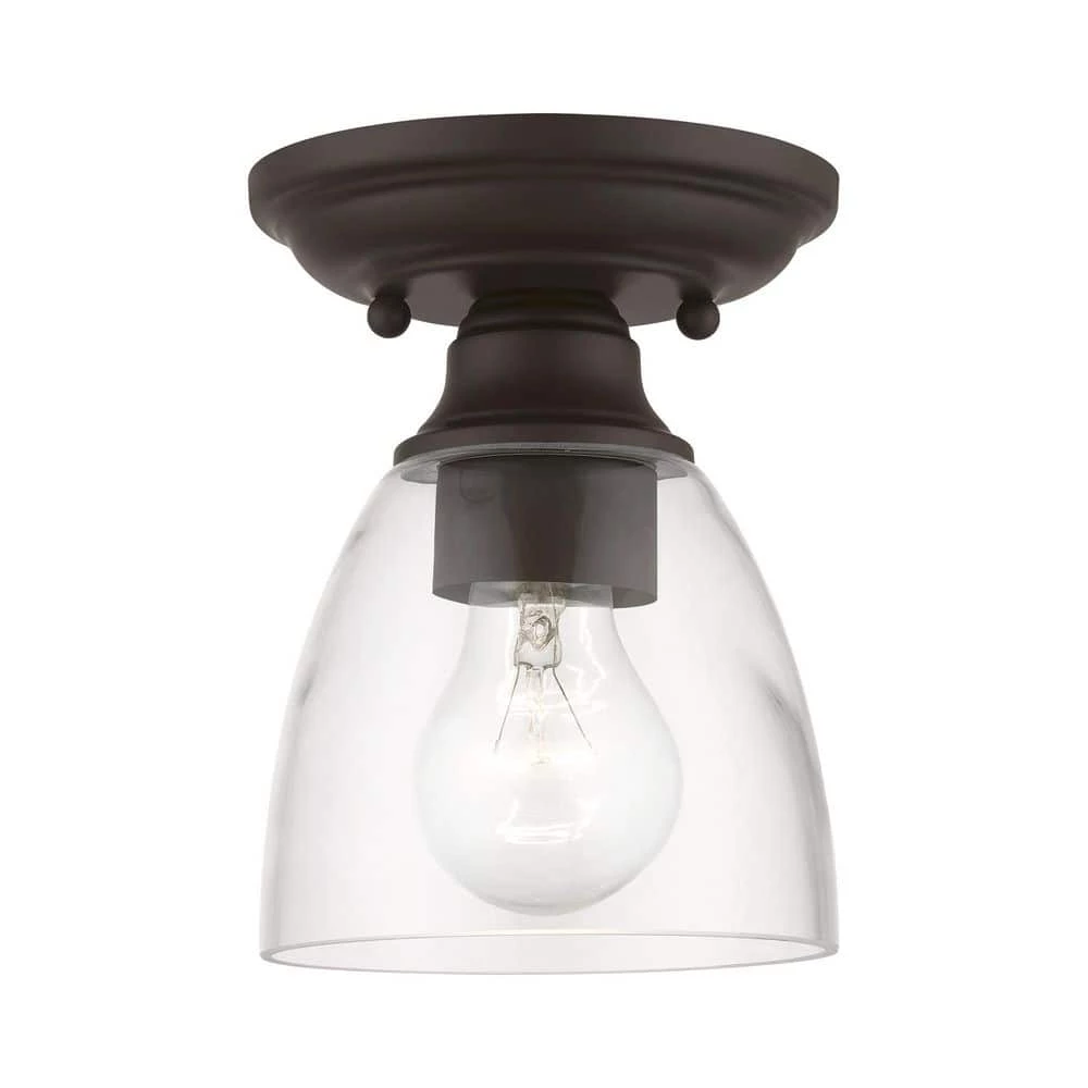 Whether it’s style or practical lighting, this flush mount is the perfect addition to your bathroom or hallway. This single-light fixture from the Montgomery Collection features a clear hand-blown glass shade and is shown in a bronze finish. The clean graceful lines of the canopy complement the shade, creating an understated look that works well in most decors. Classic elegance combines with contemporary appeal to enhance any home in style.