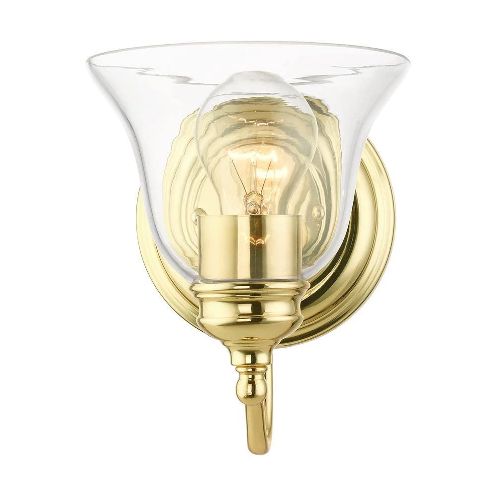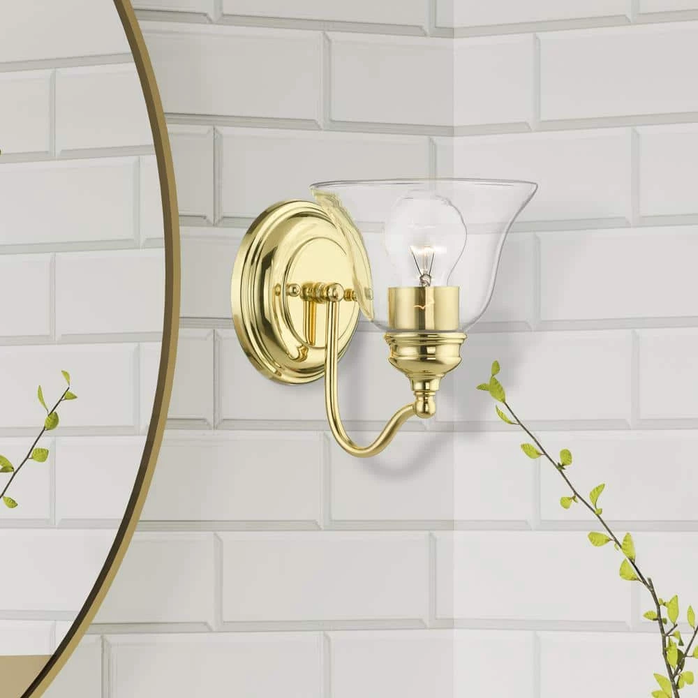 Livex Lighting is well known for quality, style and value. Bring a refined lighting style to your bath area with this Moreland collection 1-light vanity sconce. Shown in a polished brass finish and clear glass.