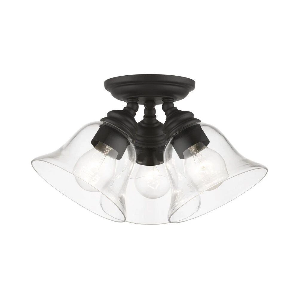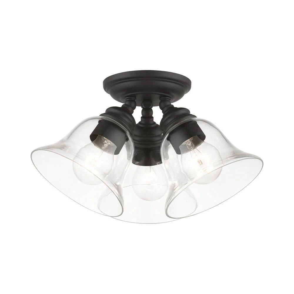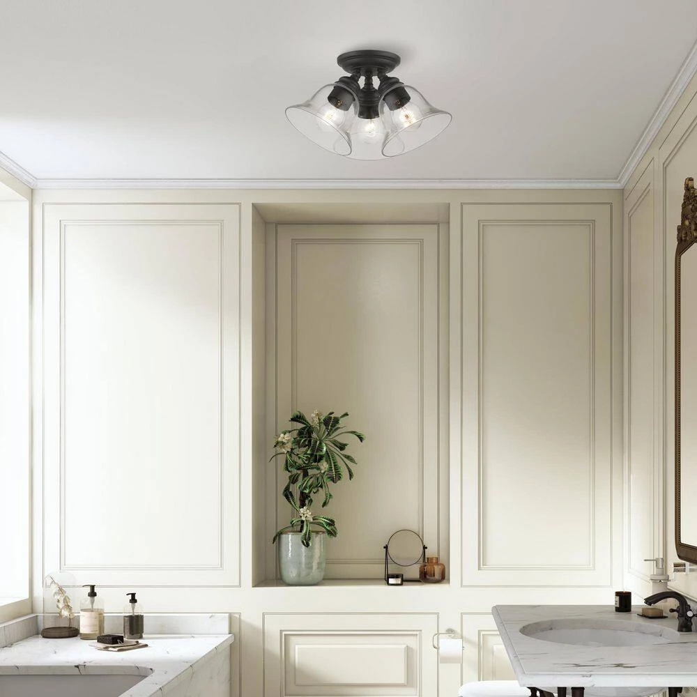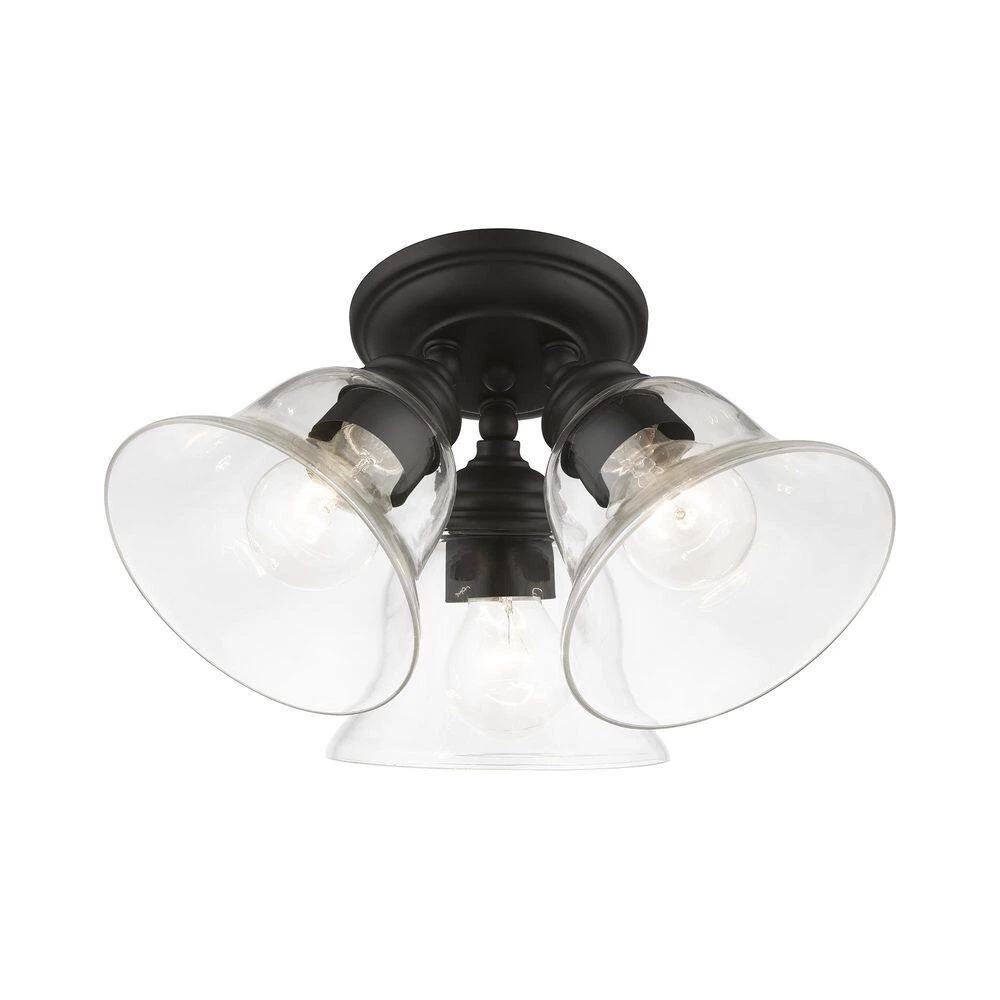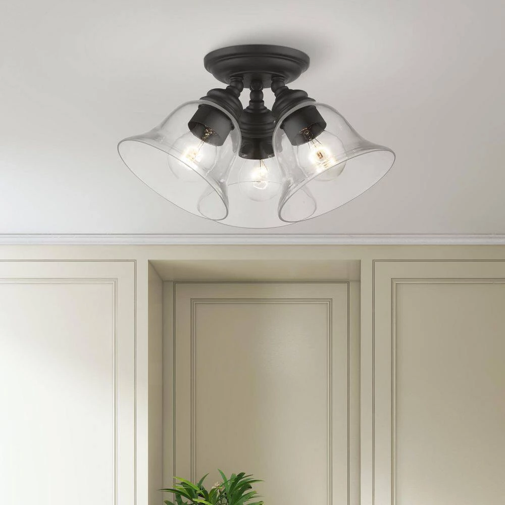 Whether it’s style or practical lighting, this flush mount is the perfect addition to your bathroom, kitchen, hallway or bedroom. This 3-light fixture from the Moreland Collection features clear hand-blown glass shades and is shown in a black finish. The clean graceful lines of the canopy complement the shades, creating an understated look that works well in most decors. Classic elegance combines with contemporary appeal to enhance any home in style.