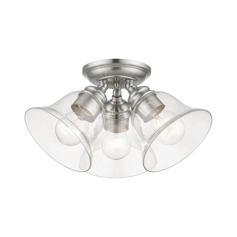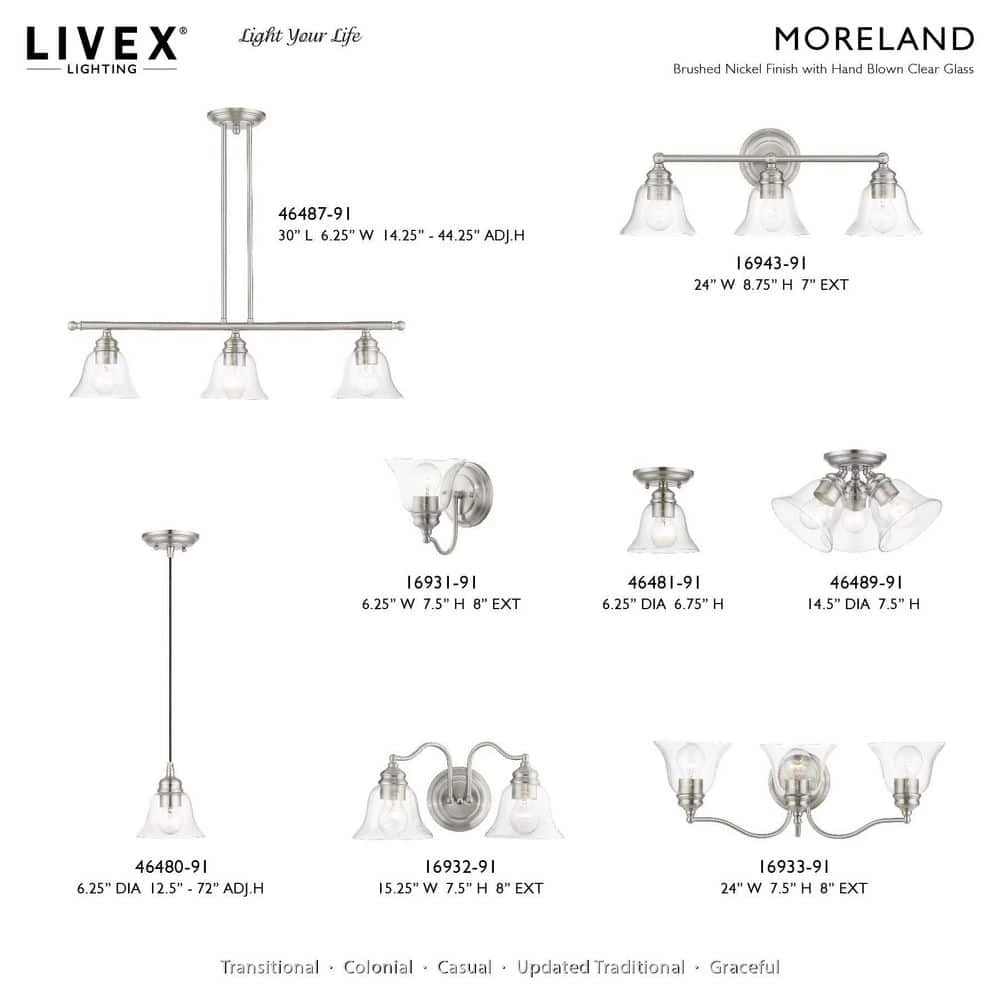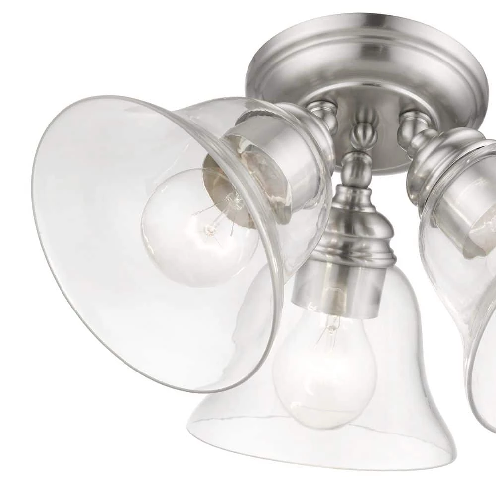 Whether it’s style or practical lighting, this flush mount is the perfect addition to your bathroom, kitchen, hallway or bedroom. This 3-light fixture from the Moreland Collection features clear hand-blown glass shades and is shown in a brushed nickel finish. The clean graceful lines of the canopy complement the shades, creating an understated look that works well in most decors. Classic elegance combines with contemporary appeal to enhance any home in style.