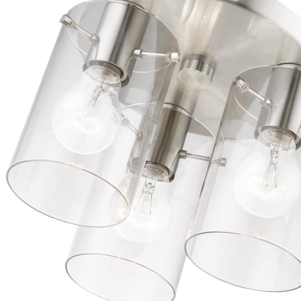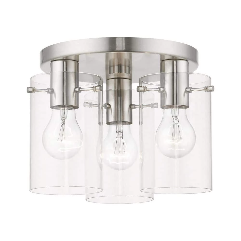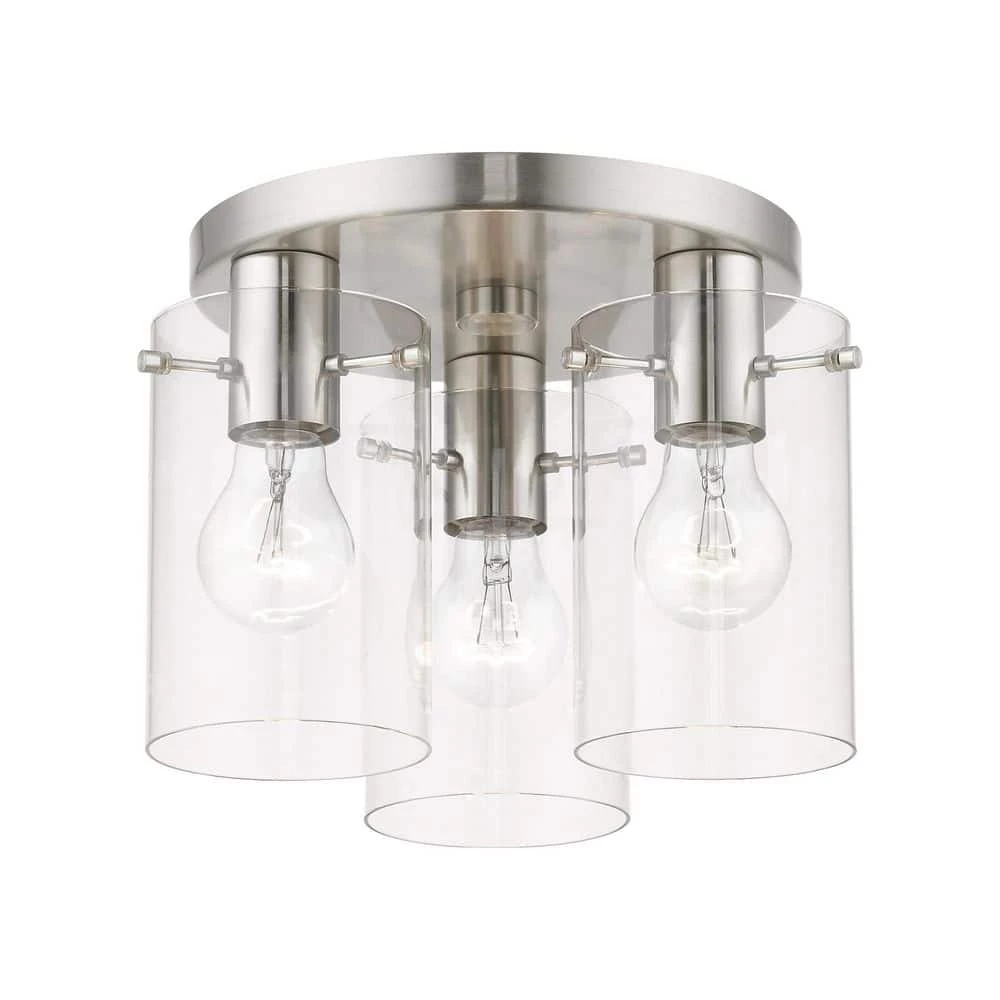 Illuminate your home with a bright design from the Munich collection. This large 3-light flush mount features a brushed nickel finish with clear glass. Perfect for a contemporary or transitional luxury bathroom, bedroom, kitchen or hallway setting.