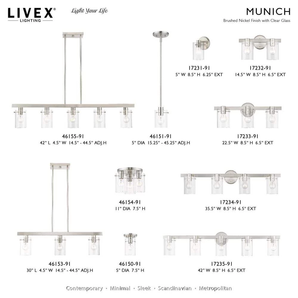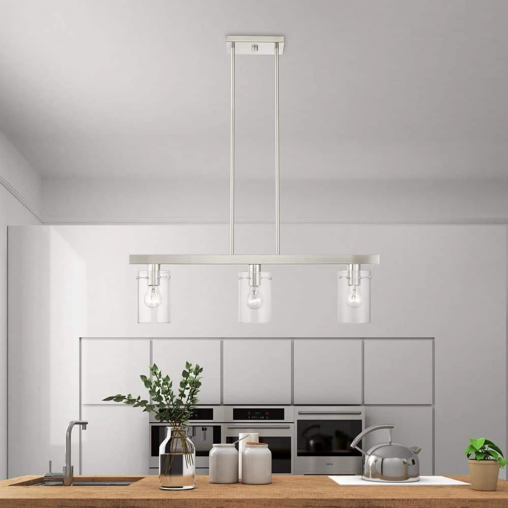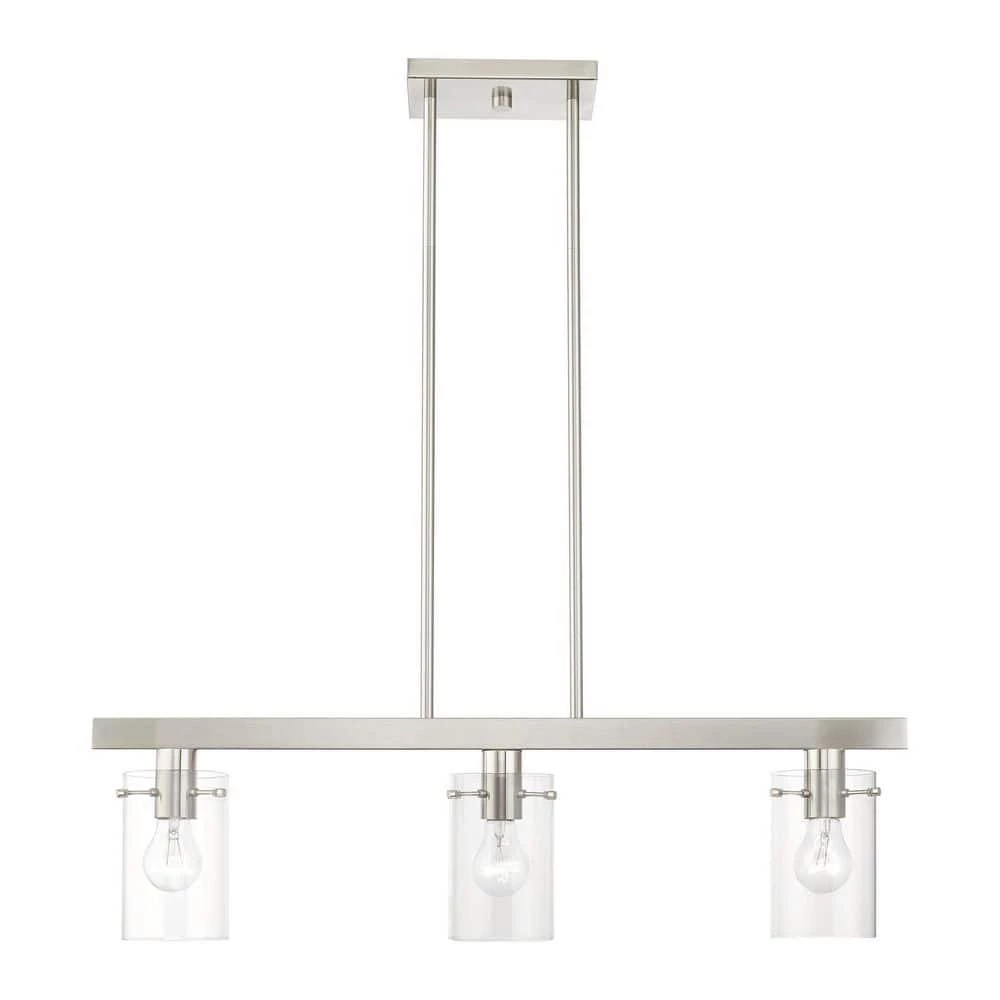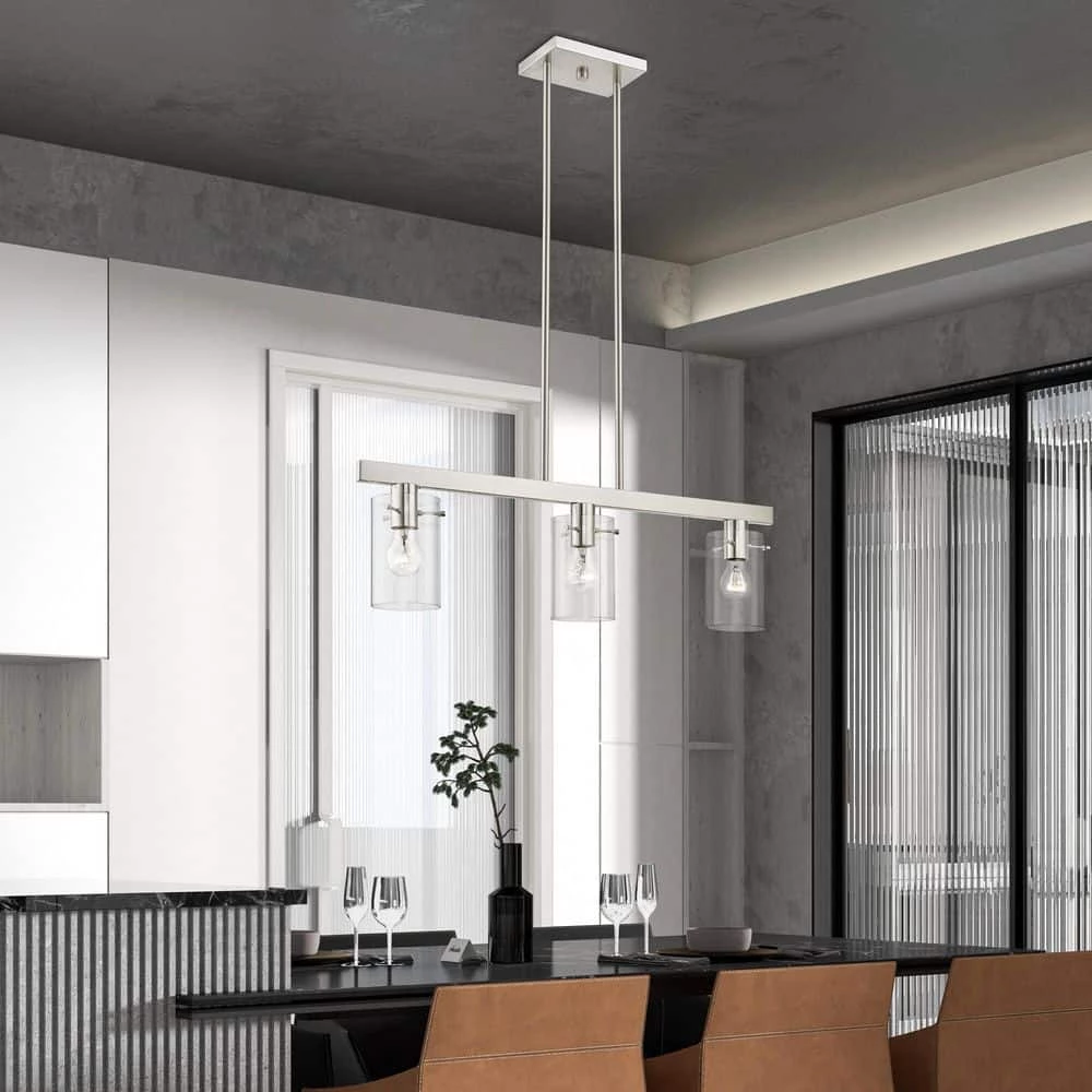 Illuminate your home with a bright design from the Munich collection. This 3-light down linear chandelier features a brushed nickel finish with clear glass. Perfect for a contemporary or transitional luxury kitchen or dining room setting.