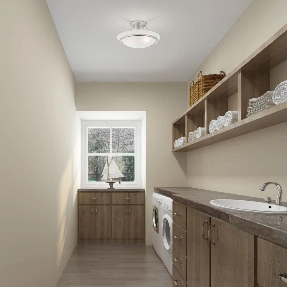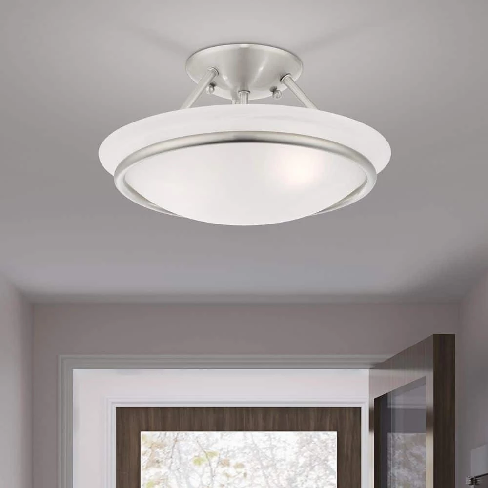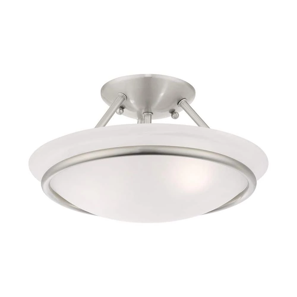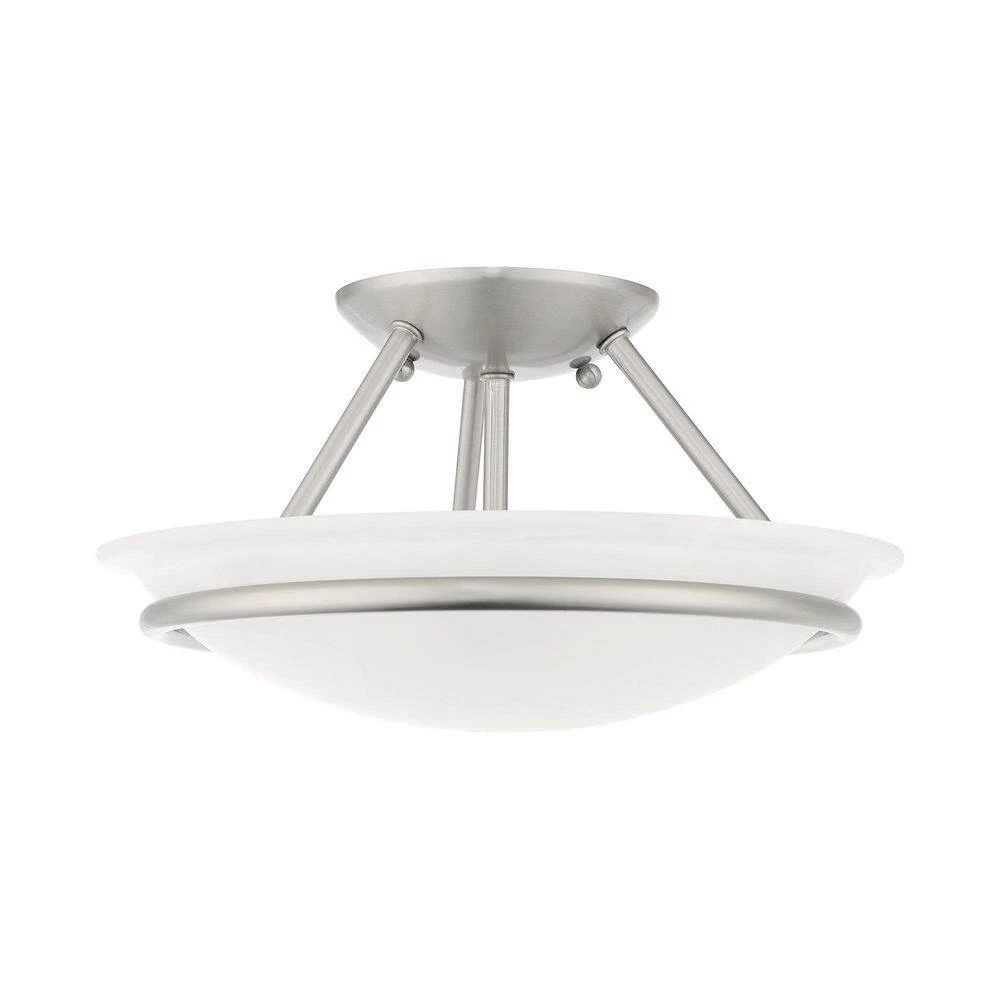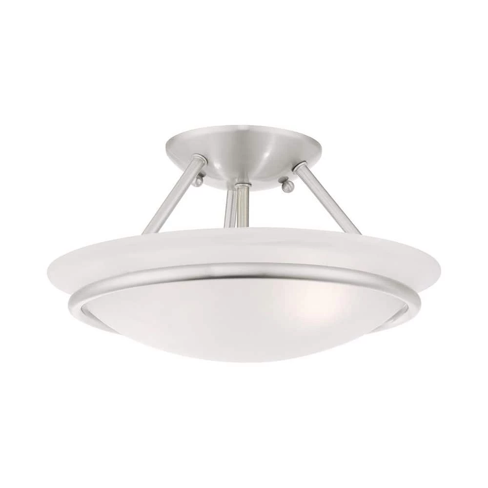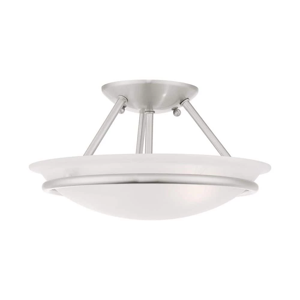 Livex Lighting is well known for quality, style and value. This 2 light semi flush mount features a lustrous brushed nickel finish with light glowing from within the large white alabaster glass bowl shape shade. complete a kitchen, bedroom, or any room in your house with this beautiful semi flush mount. This well-rounded fixture is sure to satisfy your lighting needs.