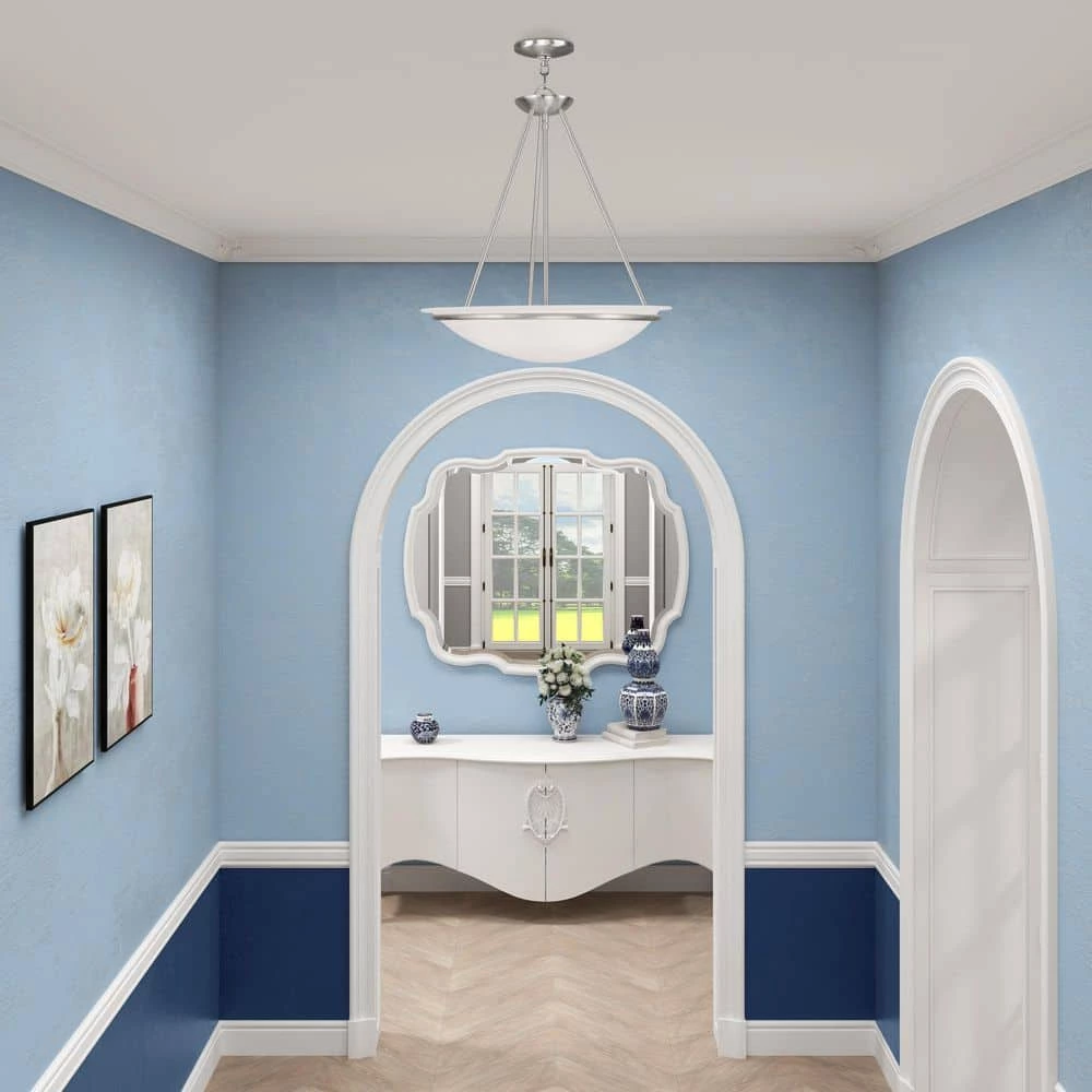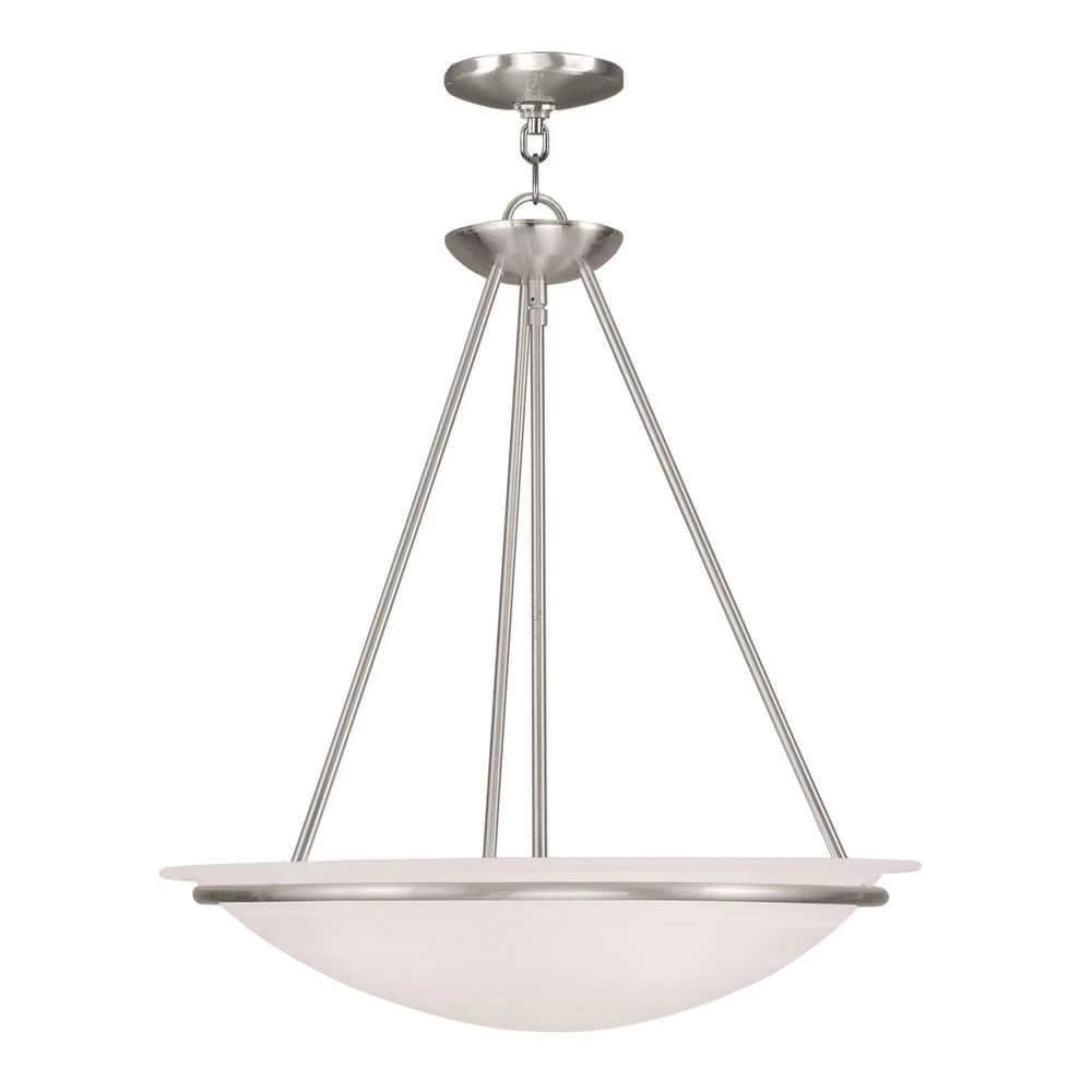 This three light pendant features a lustrous brushed nickel finish with light glowing from within the large white alabaster glass bowl shape shade. complete a kitchen or dining room with this beautiful pendant. This well-rounded fixture is sure to satisfy your lighting needs.
