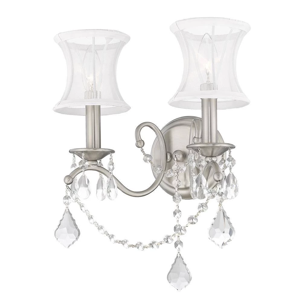 Livex Lighting is well known for quality, style and value. Add glamour to your home with this enchanting wall sconce. Scrolling arms adorned in a brushed nickel finish is paired with glittering crystal drops that reflect light when illuminated. White handmade silk shimmer shades complete this chic design. This well-rounded fixture is sure to satisfy your lighting needs.