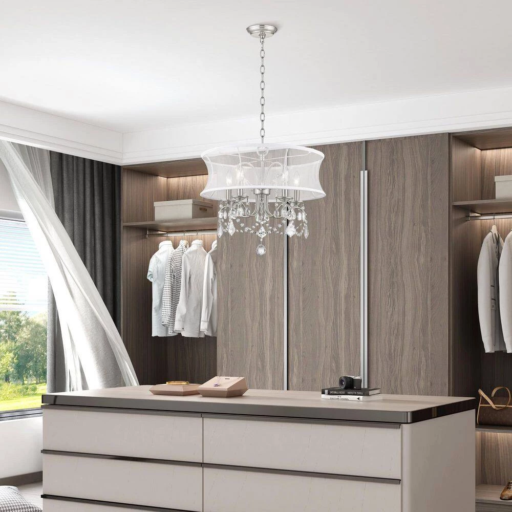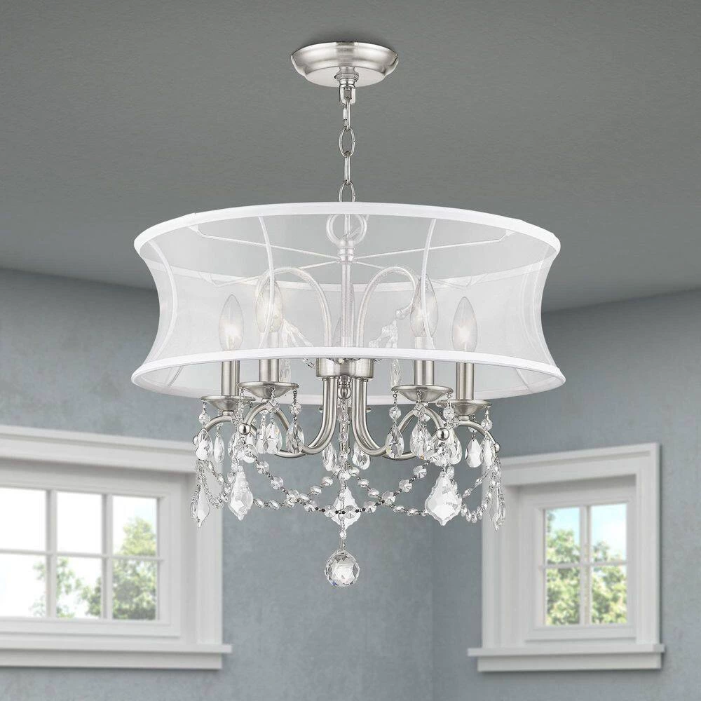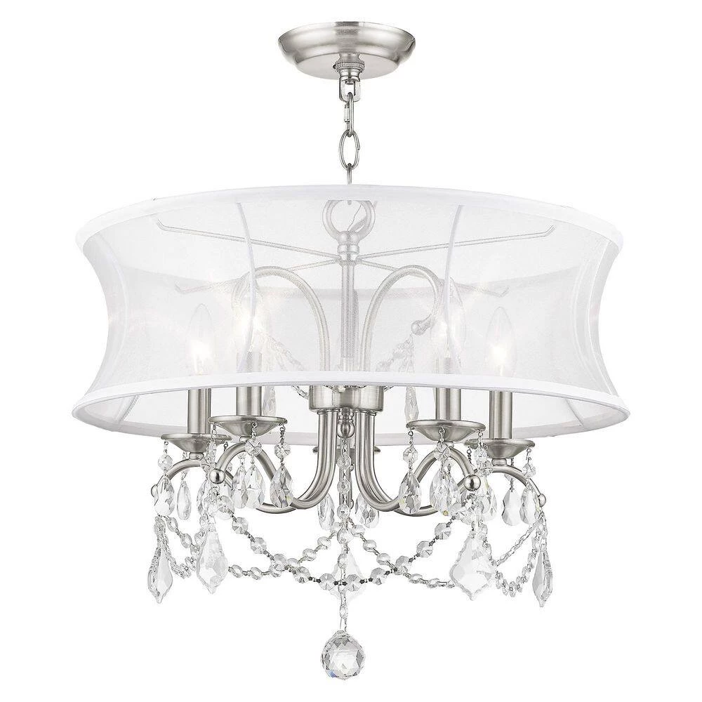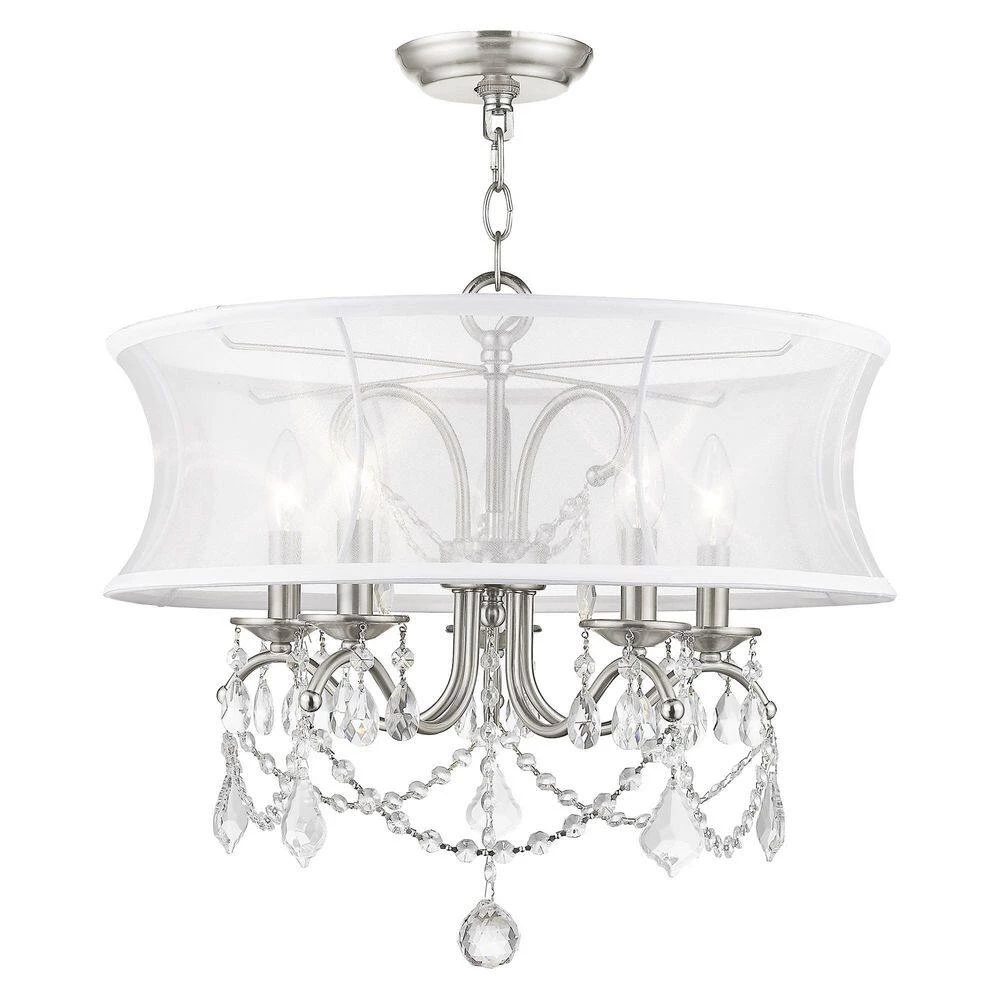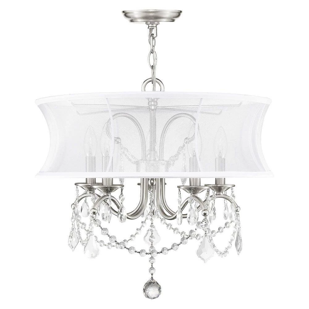 Add glamour to your home with this enchanting shaded chandelier. Scrolling arms adorned in a brushed nickel finish are paired with glittering crystal drops that reflect light when illuminated. A white handmade silk shimmer shade completes this chic design.