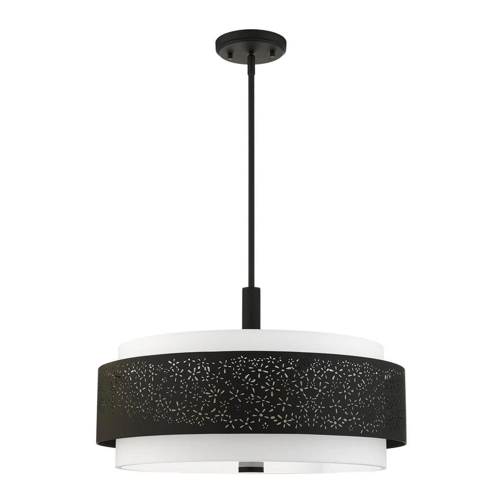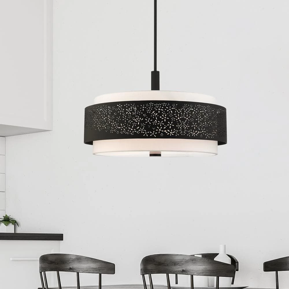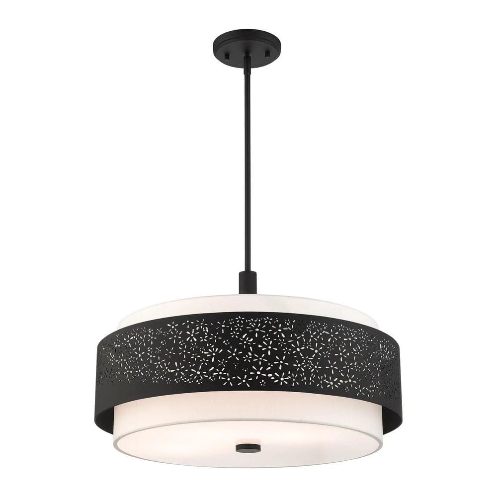 Livex Lighting is well known for quality, style and value. The Noria collection combines an intricate organic laser cut black finish steel frame surrounds an off-white fabric shade creating a casual warm light with a touch of nature vibe. This large 5-light drum pendant will have a commanding presence in many areas of your home. You can suspend it in the living room, over the dining table or bedroom. This well-rounded fixture is sure to satisfy your lighting needs.