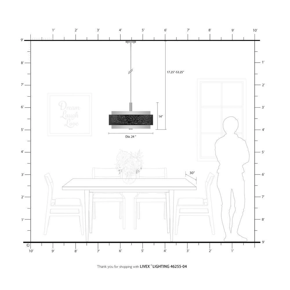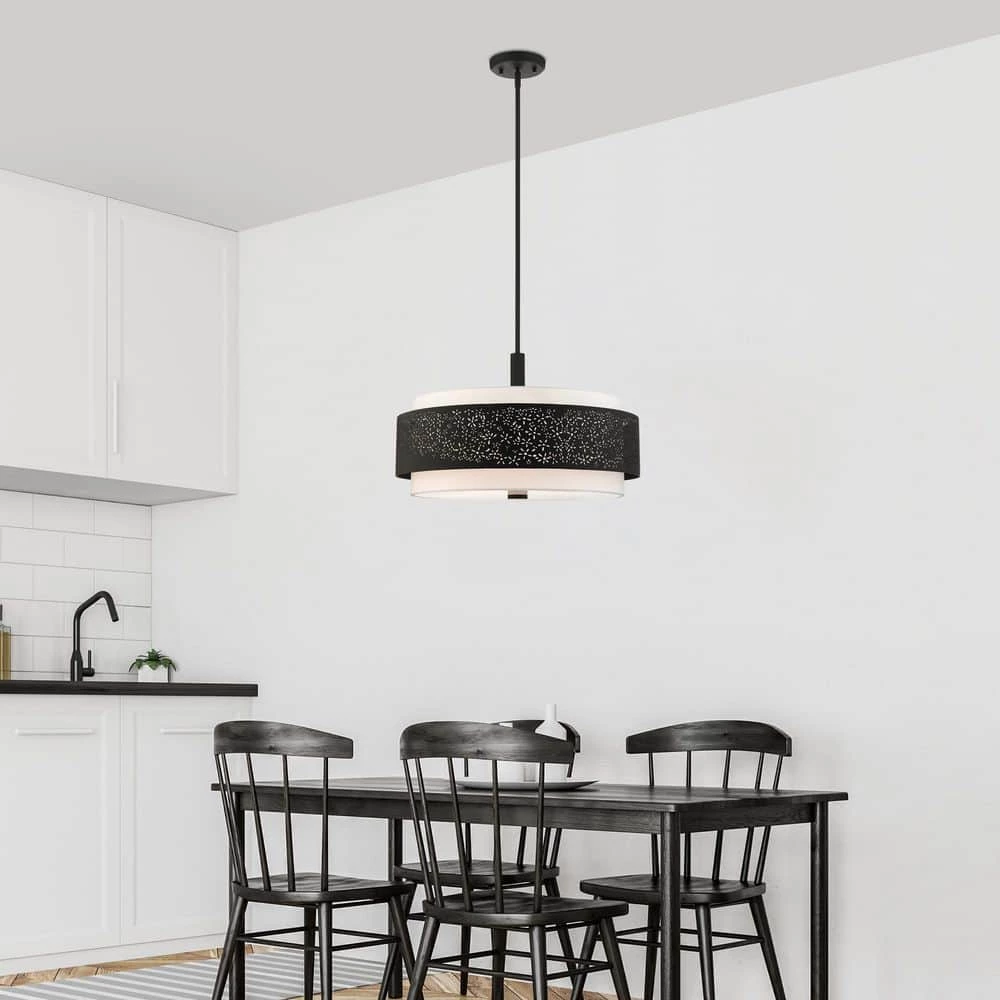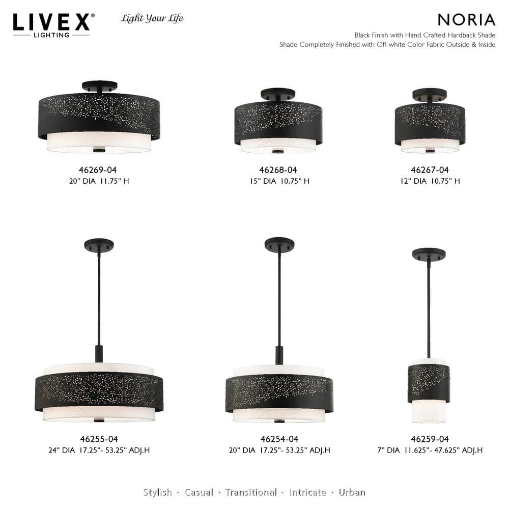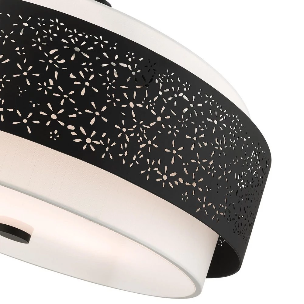 Livex Lighting is well known for quality, style and value. The Noria collection combines an intricate organic laser cut black finish steel frame surrounds an off-white fabric shade creating a casual warm light with a touch of nature vibe. This large 5-light drum pendant will have a commanding presence in many areas of your home. You can suspend it in the living room, over the dining table or bedroom. This well-rounded fixture is sure to satisfy your lighting needs.