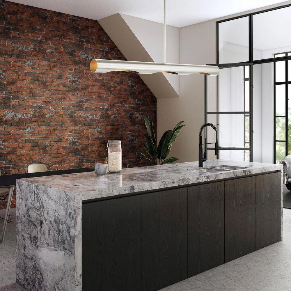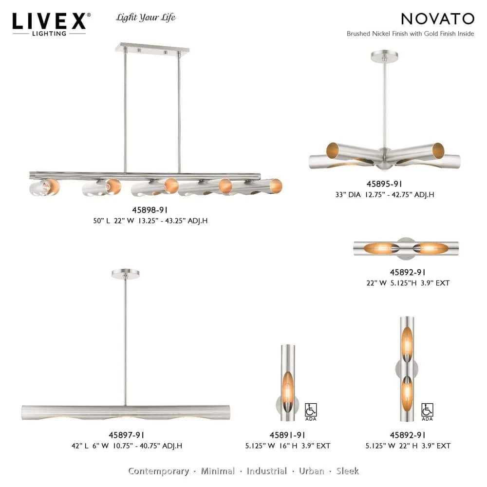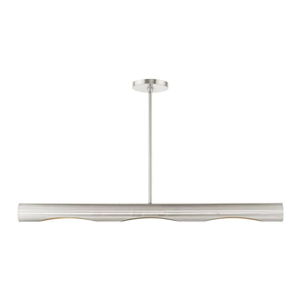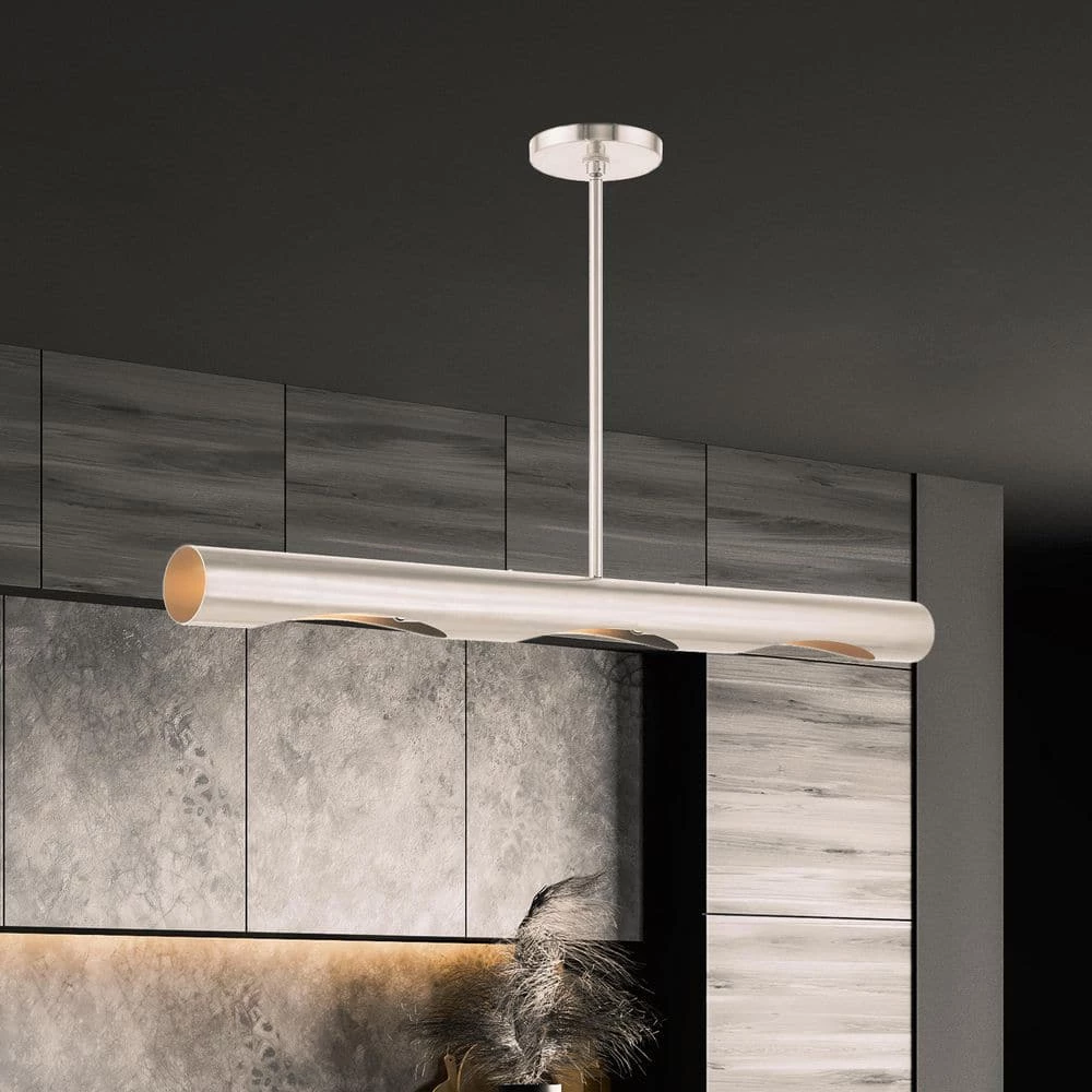 The minimalistic Novato collection was inspired by the industrial landscape of metropolitan cities across Europe and Asia. Tubular shapes are interrupted by clever cutouts to create a visually interesting light distribution. This 3-light brushed nickel finish linear chandelier will integrate into a contemporary, minimal, urban or sleek interior design setting.
