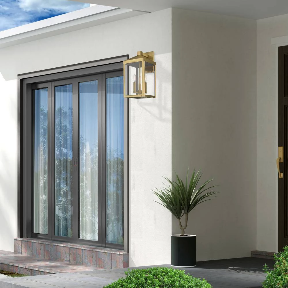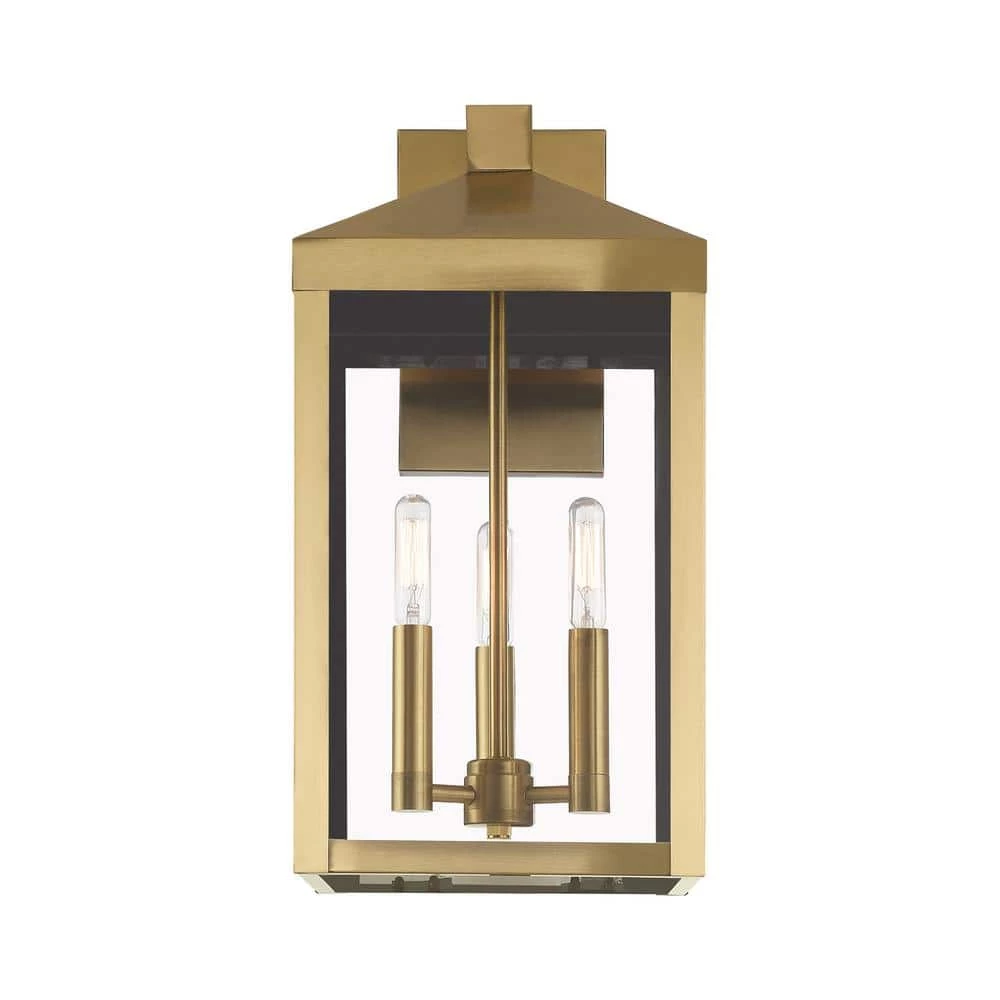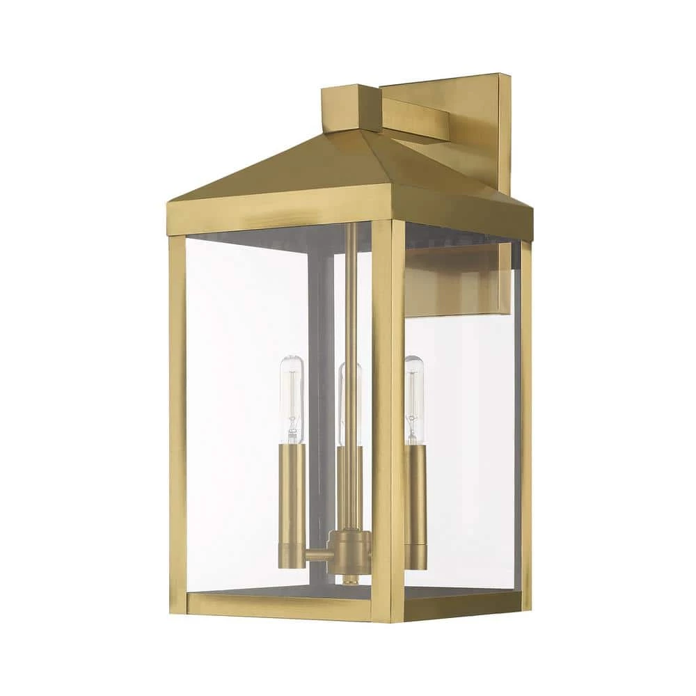 The dramatically simple shape and bold lines help define our Nyack wall lantern. Featured in a antique brass finish, this outdoor wall lantern has panels of clear glass. With the superb craftsmanship and affordable price this fixture is sure to tastefully indulge your extravagant side.