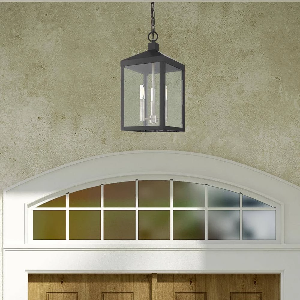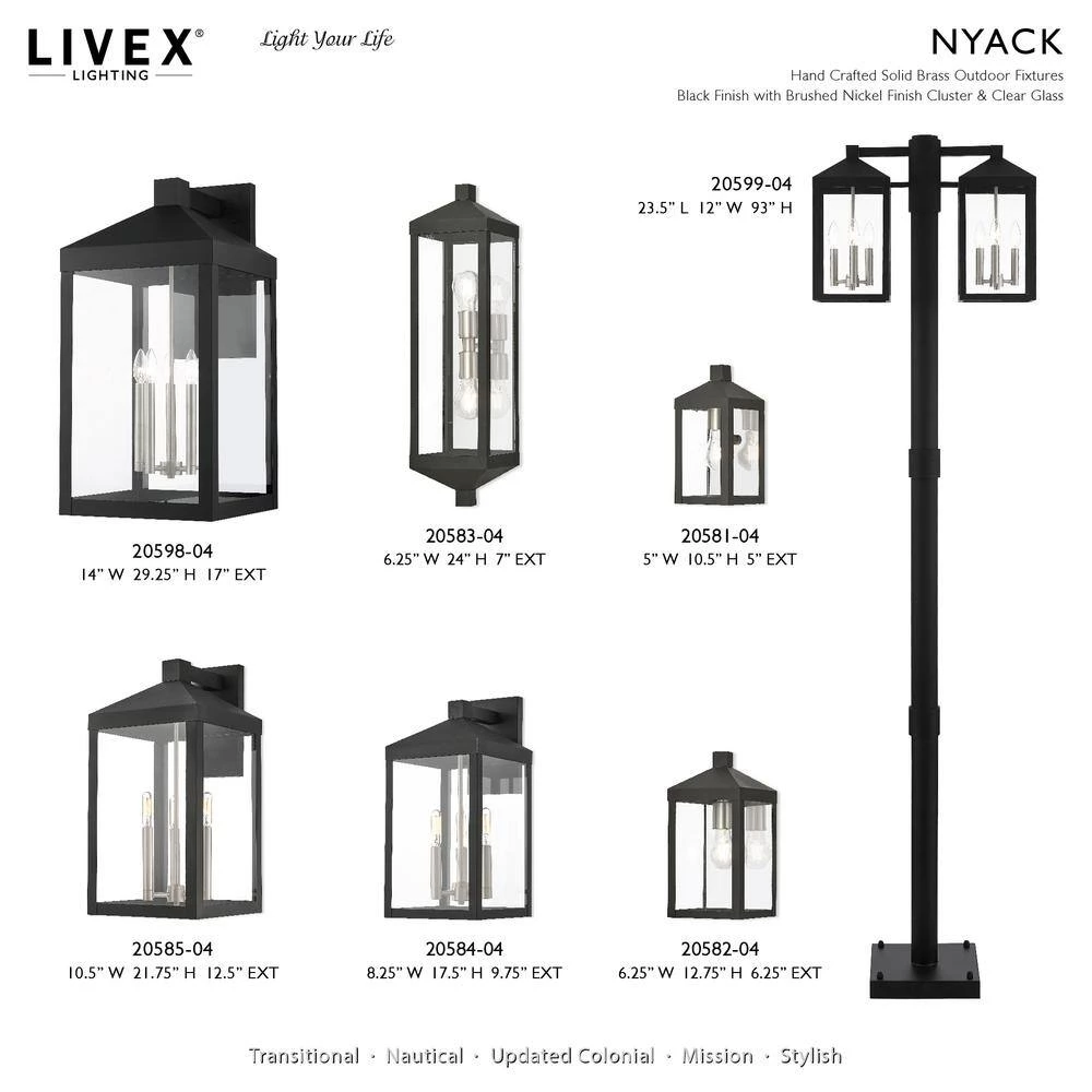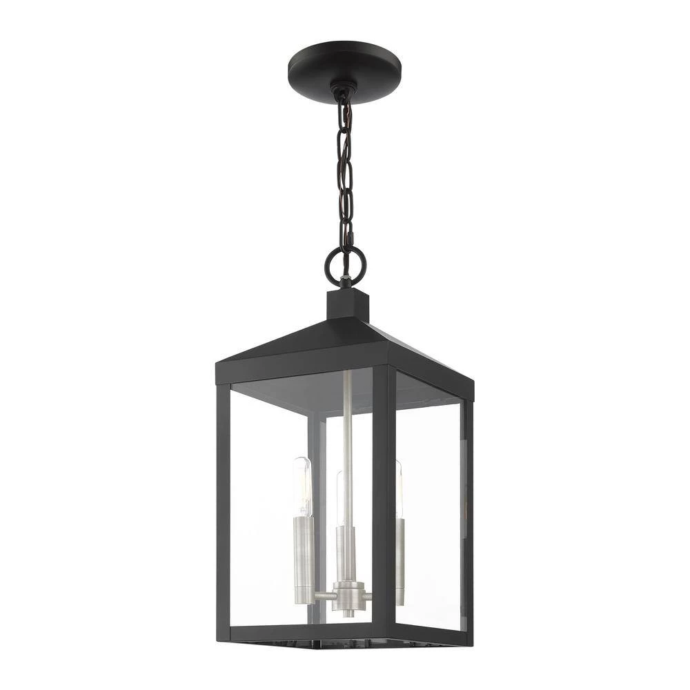 Livex Lighting is well known for quality, style and value. The dramatically simple shape and bold lines help define our Nyack wall lantern. Featured in a black finish with brushed nickel accents, this outdoor pendant lantern has panels of clear glass. This well-rounded fixture is sure to satisfy your lighting needs.
