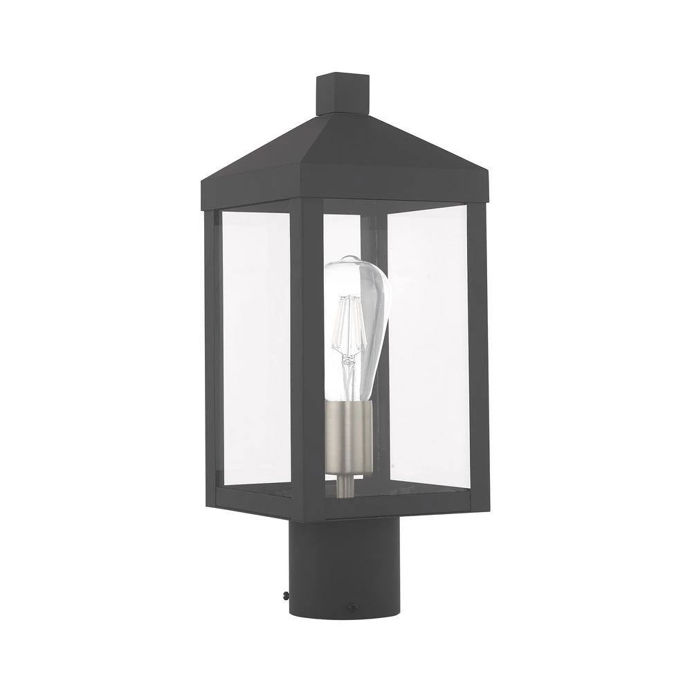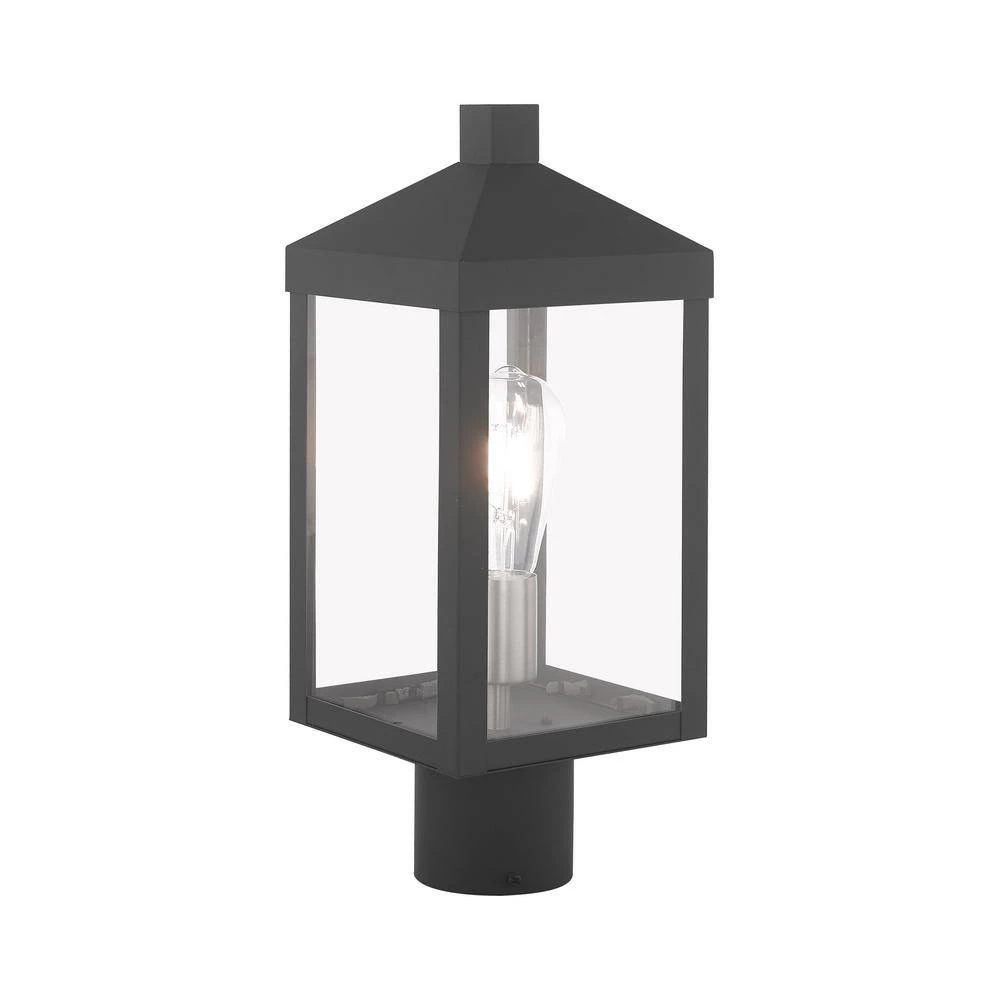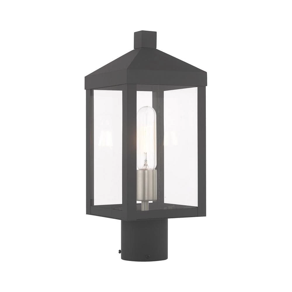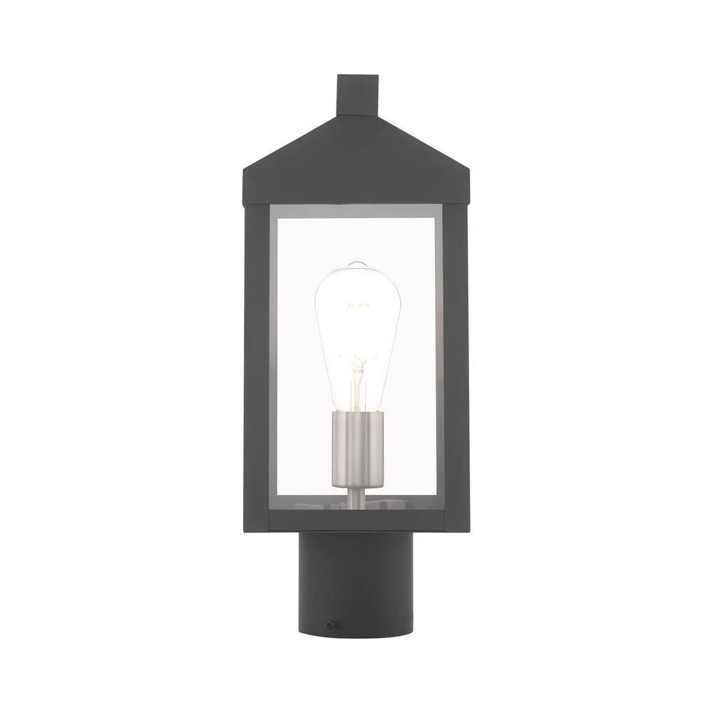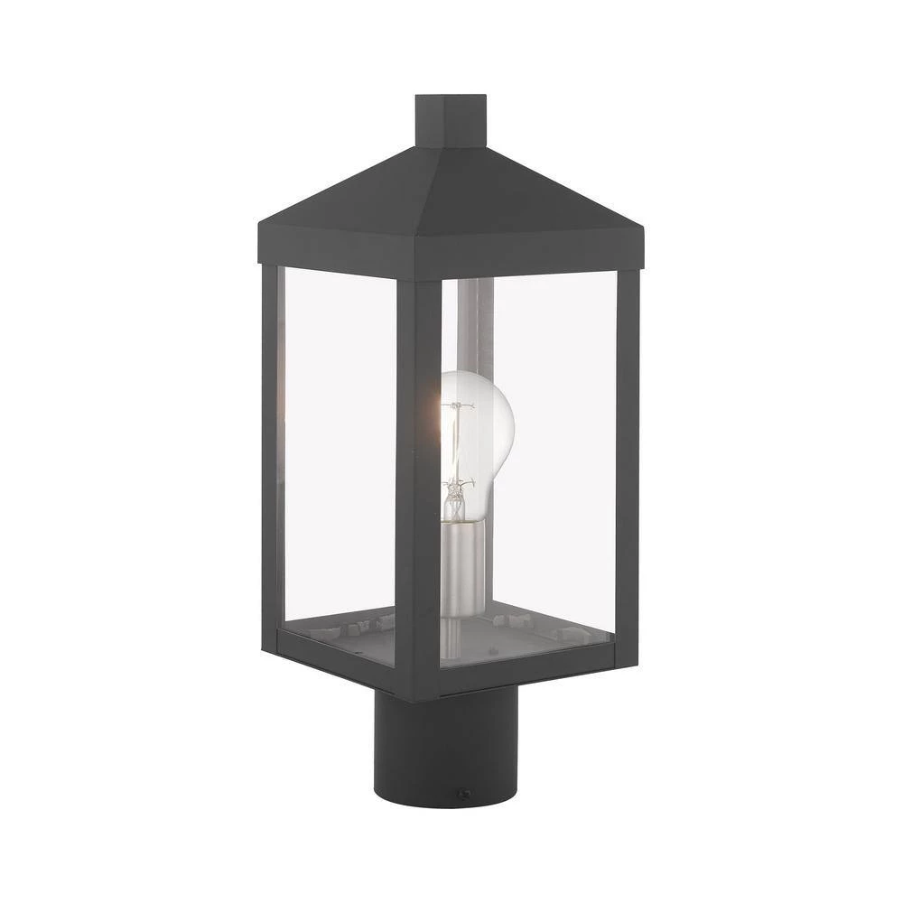 The dramatically simple shape and bold lines help define our Nyack post top lantern. Featured in a Scandinavian gray finish with panels of clear glass. With the superb craftsmanship and affordable price this fixture is sure to tastefully indulge your extravagant side.