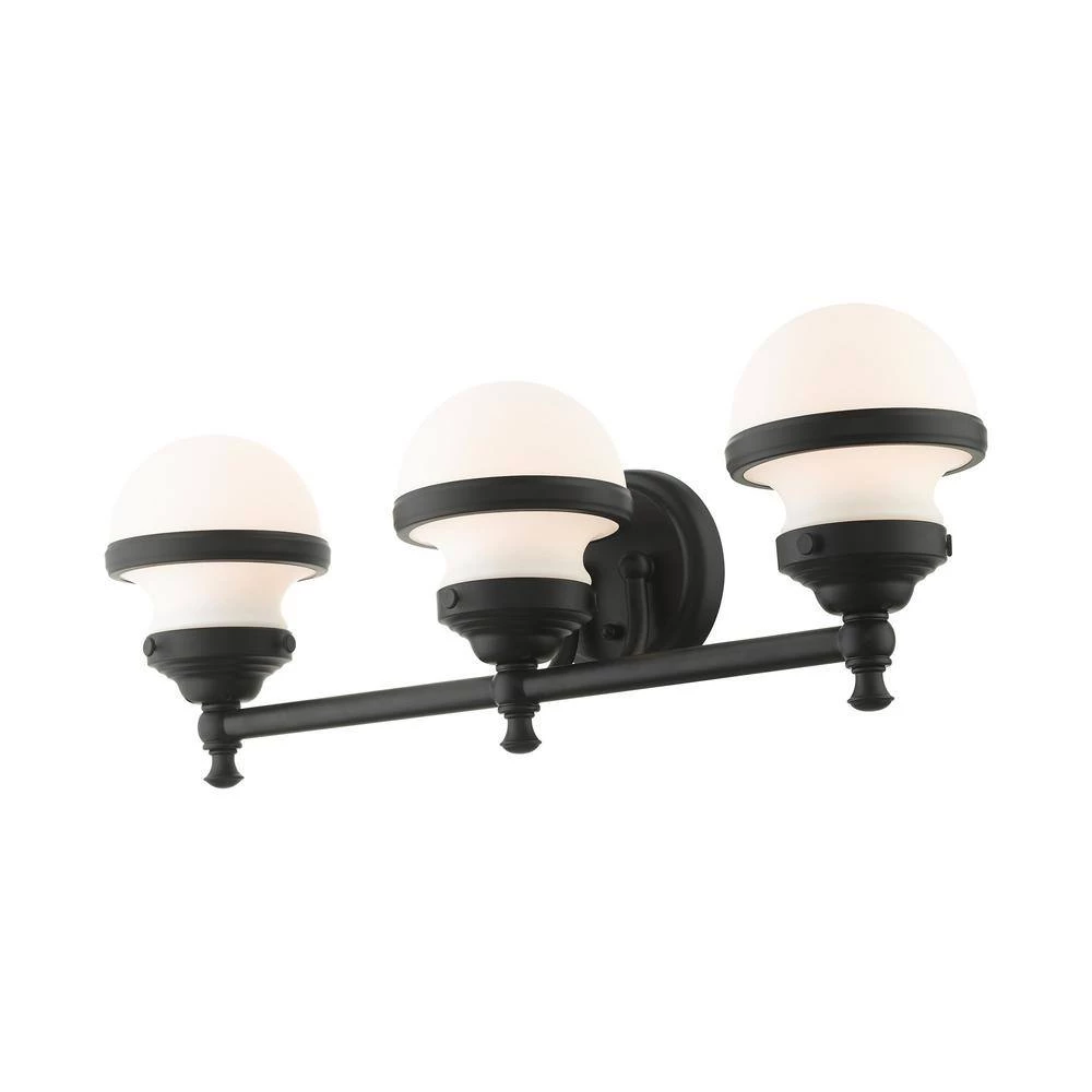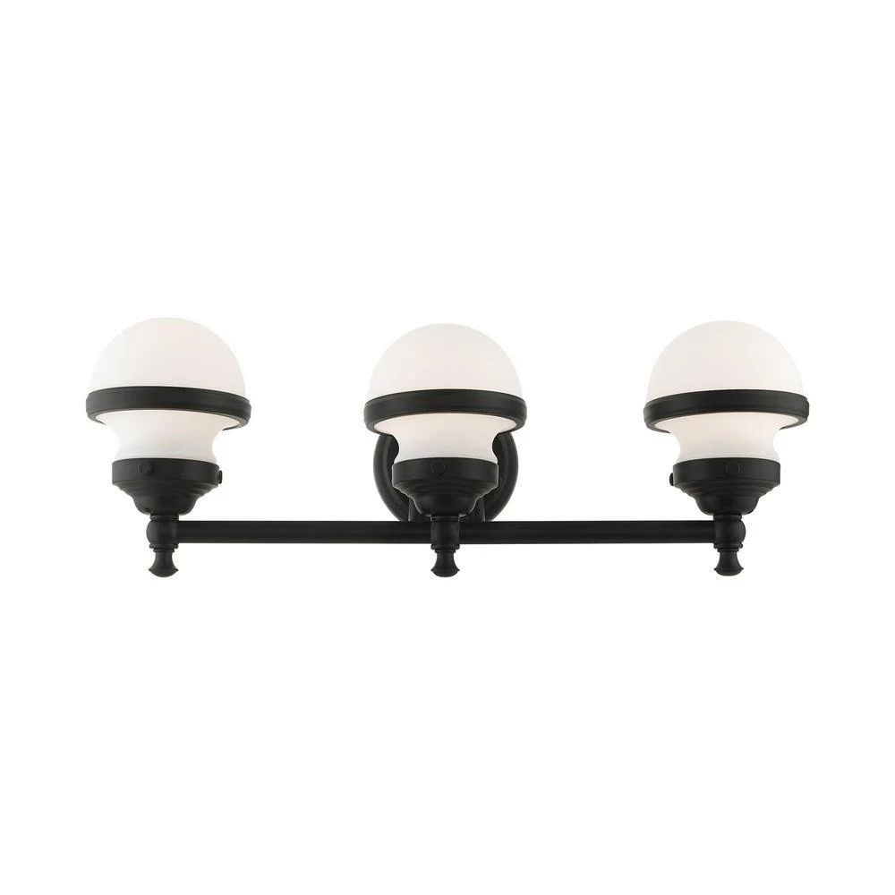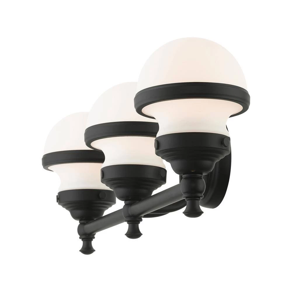 Livex Lighting is well known for quality, style and value. Sleek and simple lines define this beautiful black finish 3-light vanity sconce from the Oldwick collection. The clean, bold look of modernity blends with a raw industrial inspiration and hand blown satin opal white glass give this design a versatile and eclectic look that works with nearly any style of home decor. This well-rounded fixture is sure to satisfy your lighting needs.