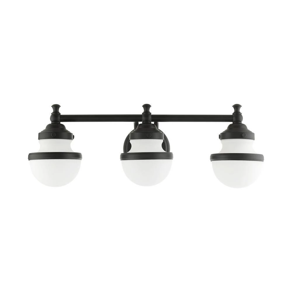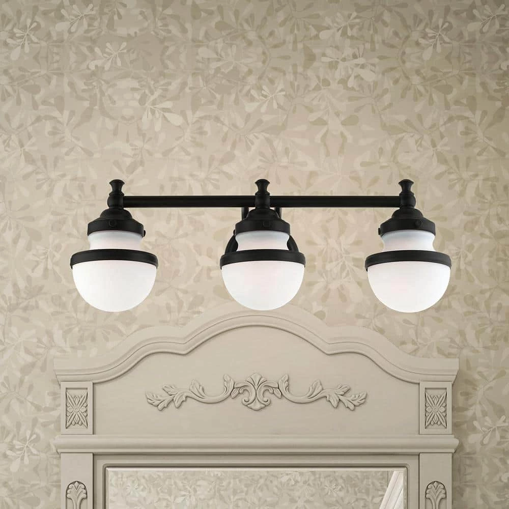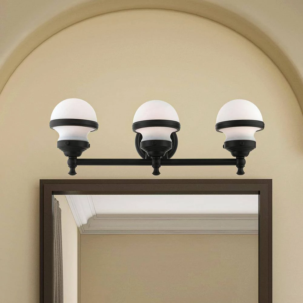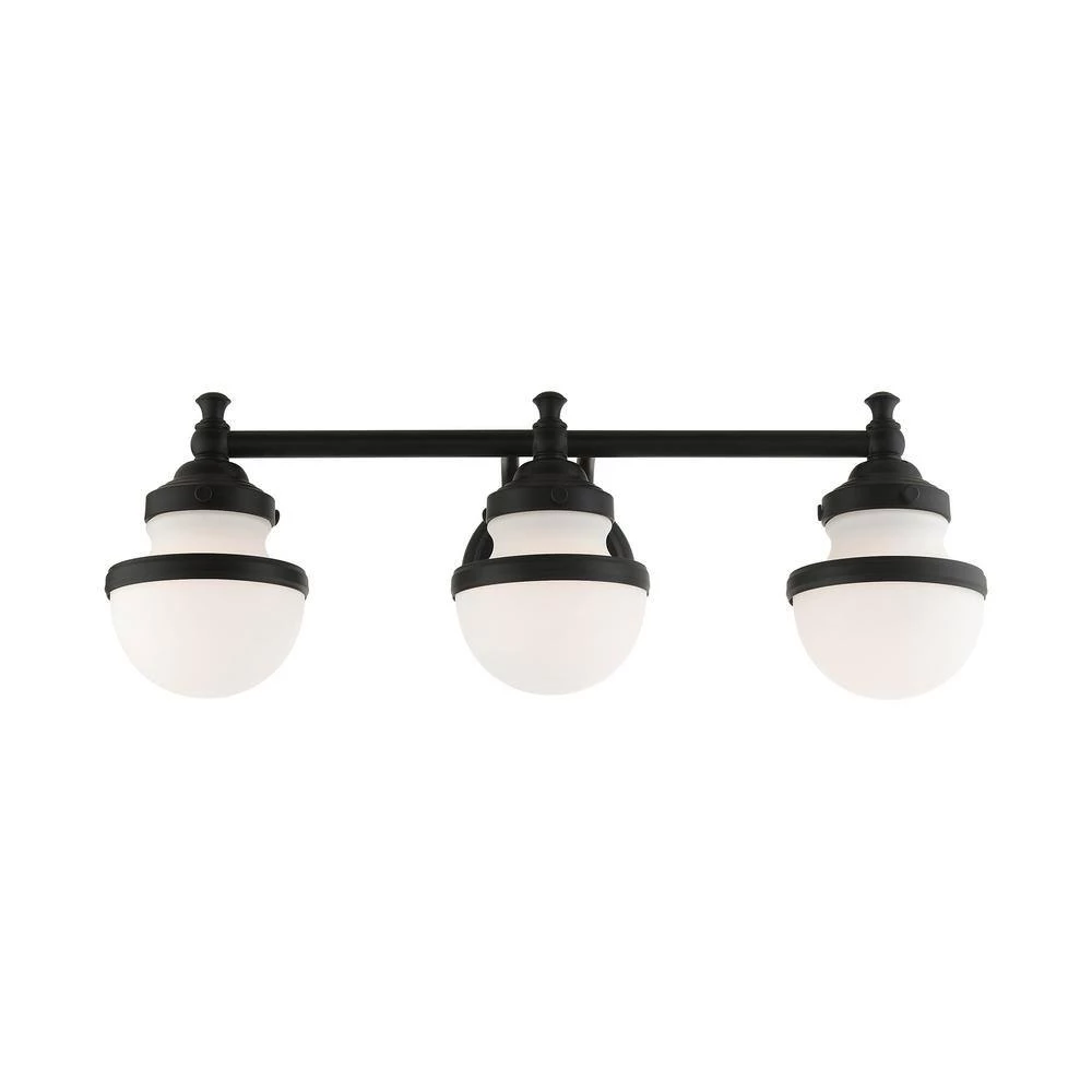 Livex Lighting is well known for quality, style and value. Sleek and simple lines define this beautiful black finish 3-light vanity sconce from the Oldwick collection. The clean, bold look of modernity blends with a raw industrial inspiration and hand blown satin opal white glass give this design a versatile and eclectic look that works with nearly any style of home decor. This well-rounded fixture is sure to satisfy your lighting needs.
