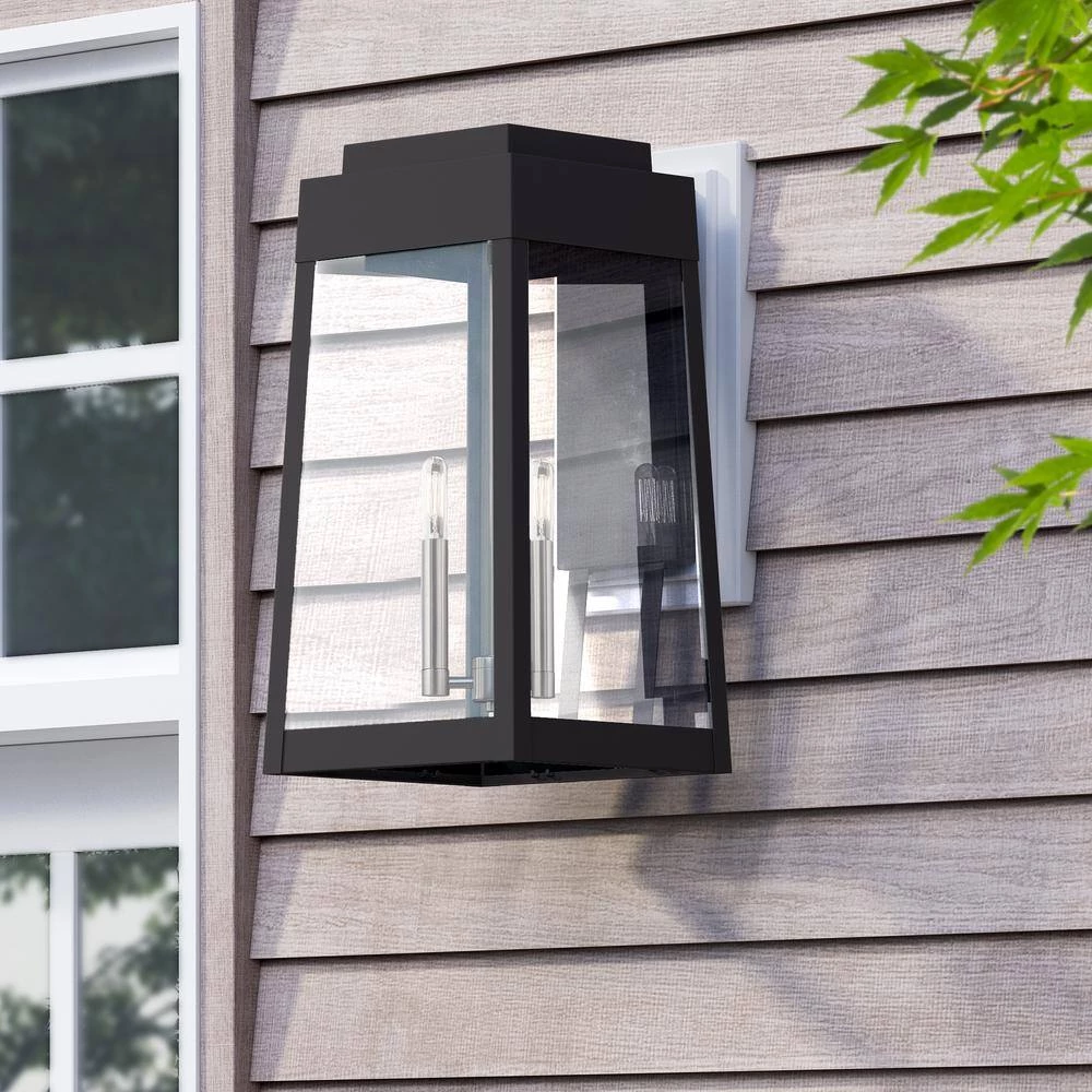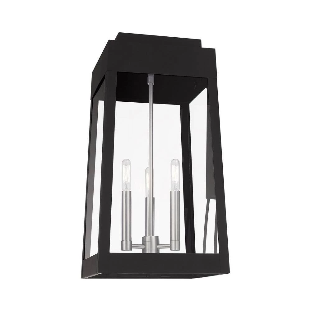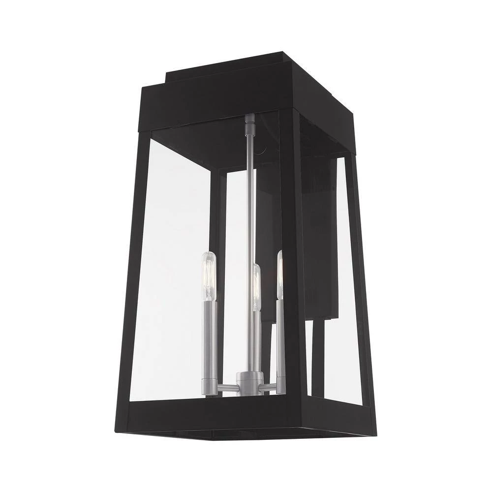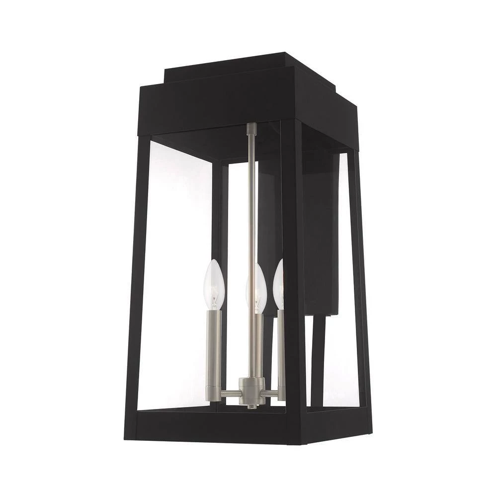 Livex Lighting is well known for quality, style and value. This updated industrial design comes in a tapering solid brass black frame with a sleek, straight-lined look. Clear glass panels offer a full view of the brushed nickel accents, that will house the bulb of your choice. This well-rounded fixture is sure to satisfy your lighting needs.