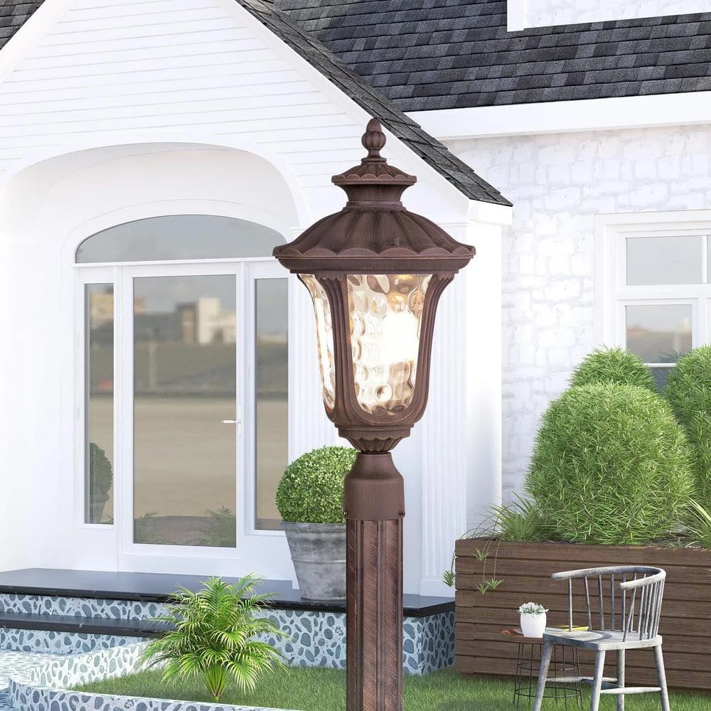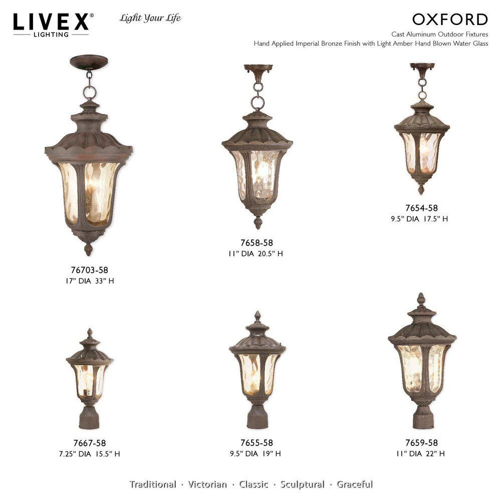 Livex Lighting is well known for quality, style and value. From the Oxford outdoor lantern collection, this traditional design will add curb appeal to any home. It features a handsome, antique-style post plate and decorative arm. Light amber water glass cast an appealing light and lends to its vintage charm. Wall plate, arm and other details are all in a imperial bronze finish. This well-rounded fixture is sure to satisfy your lighting needs.