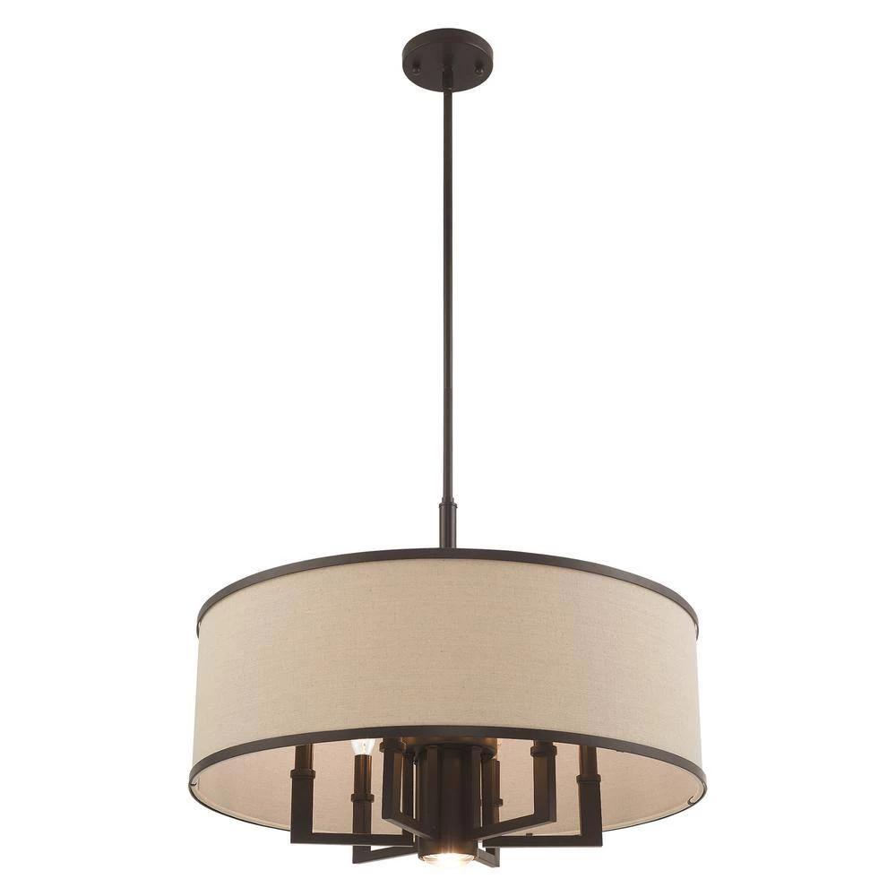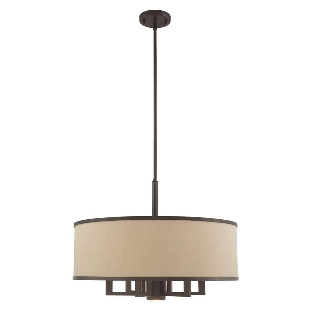 Livex Lighting is well known for quality, style and value. Update your decor with this sleek pendant light design. The angular frame comes in a bronze finish which nicely complements the hand crafted ash-gray fabric hardback shade which holds 6 bulbs and one downlight to maximize your light output. This well-rounded fixture is sure to satisfy your lighting needs.