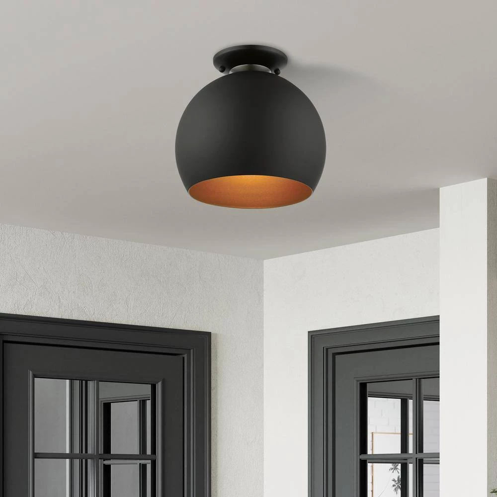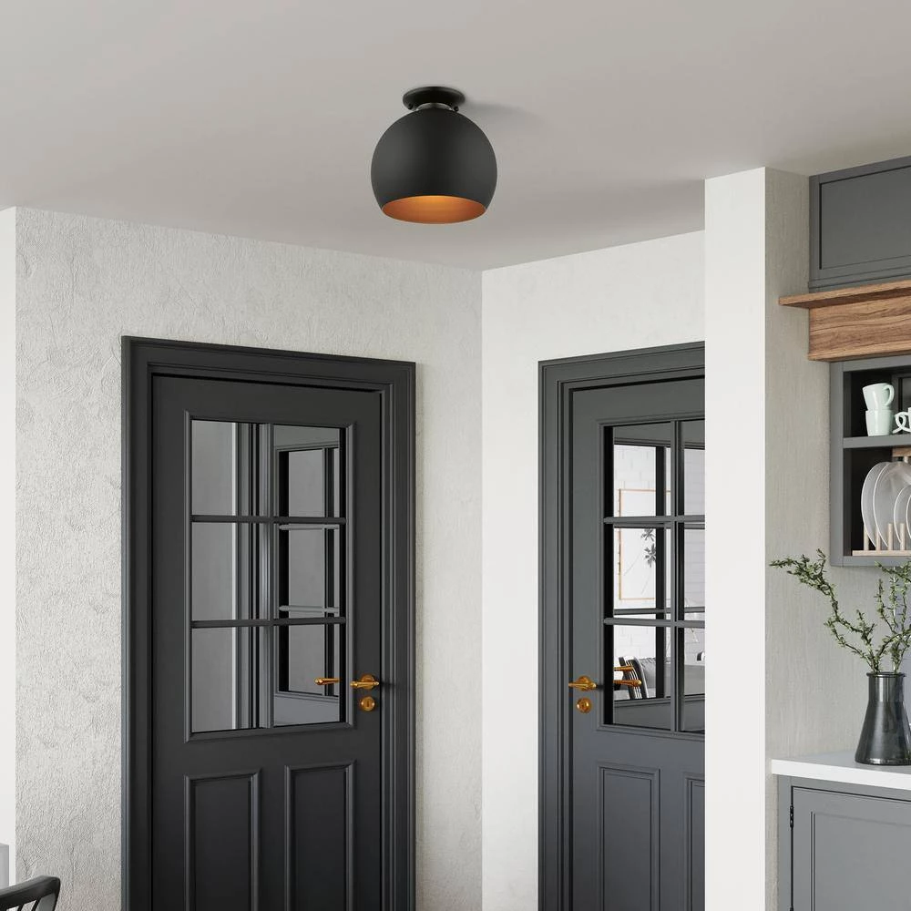 The clean and crisp Piedmont 1-light globe flush mount makes a contemporary statement with the smooth curve of its black finish shade. A gleaming gold finish on the interior of the metal shade brings a refined touch of style. A brushed nickel finish accent completes the look.