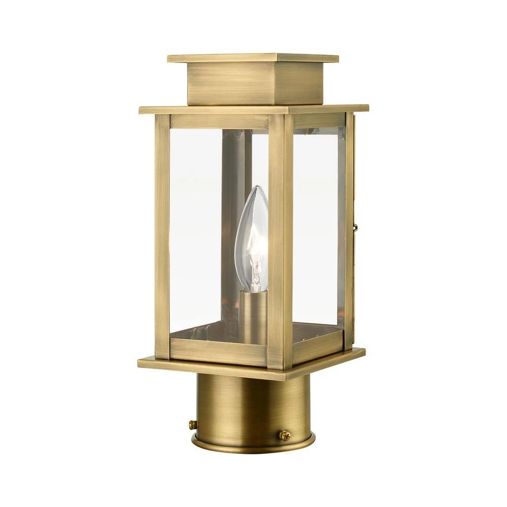 The Princeton collection is a fresh interpretation on the classic English pocket lantern. Hand crafted solid brass, our Princeton fixtures are built for lasting beauty. This outdoor post light features an antique finish and clear glass. This old world charm is built to last.