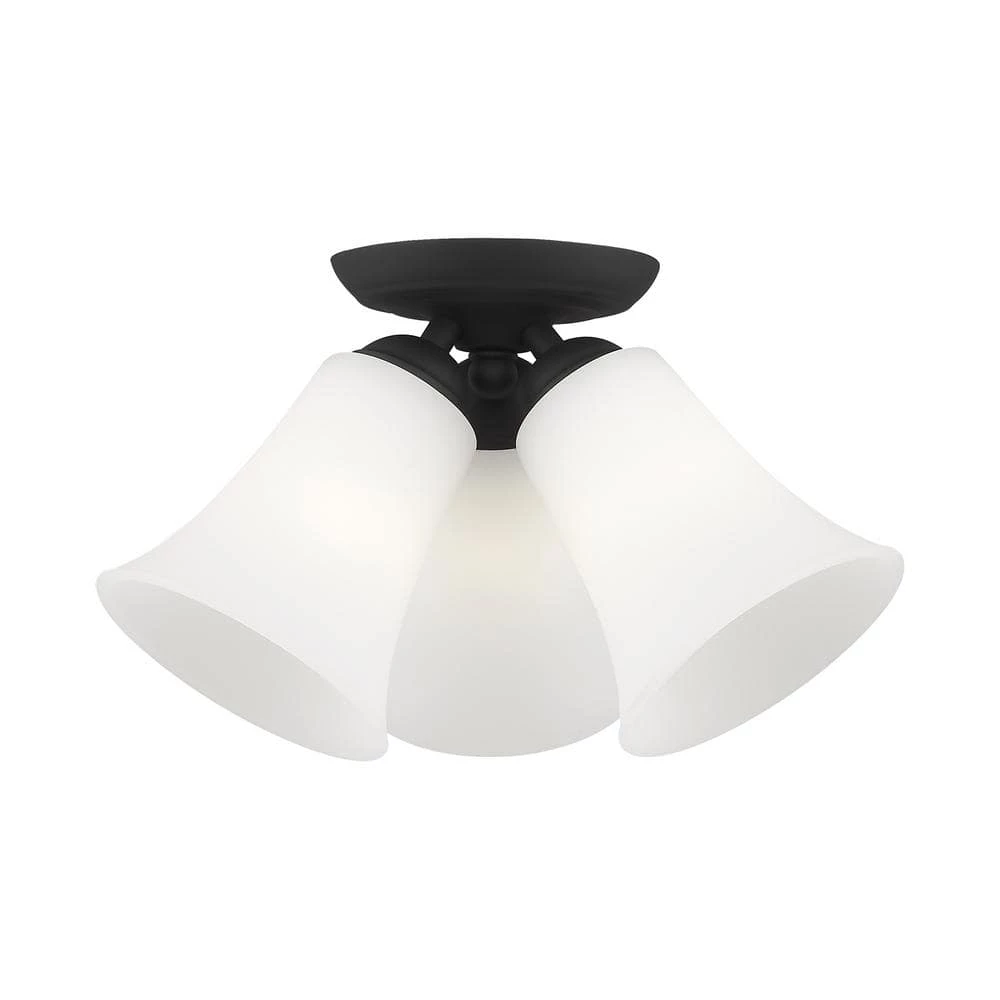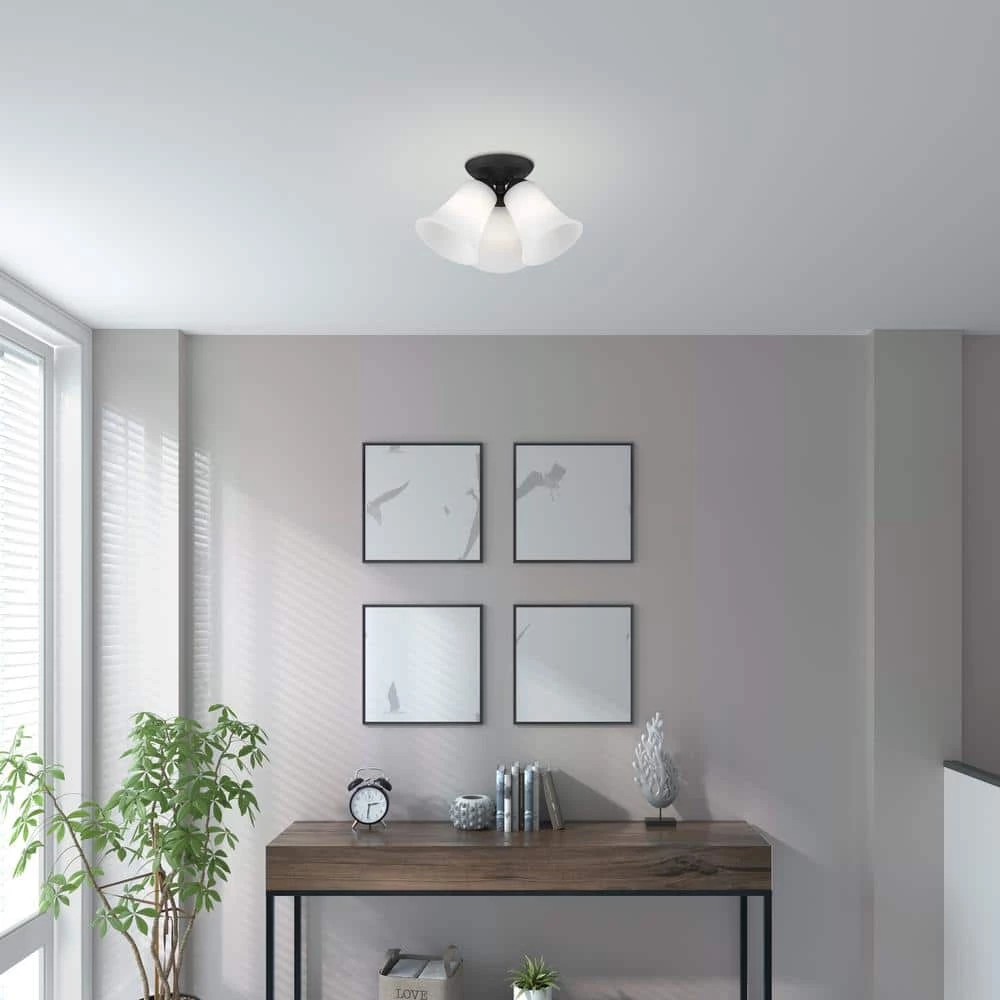 Bring a simple, yet eye-catching style into your home with this lovely flush mount. The geometric design will add interest to hallways and bathrooms alike. Painted in a black finish, this design will bring light for years to come.