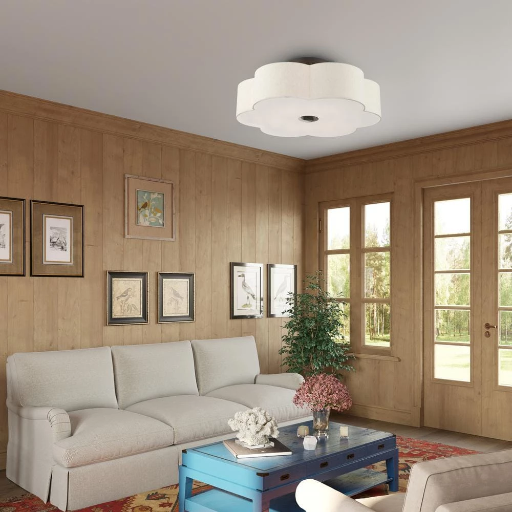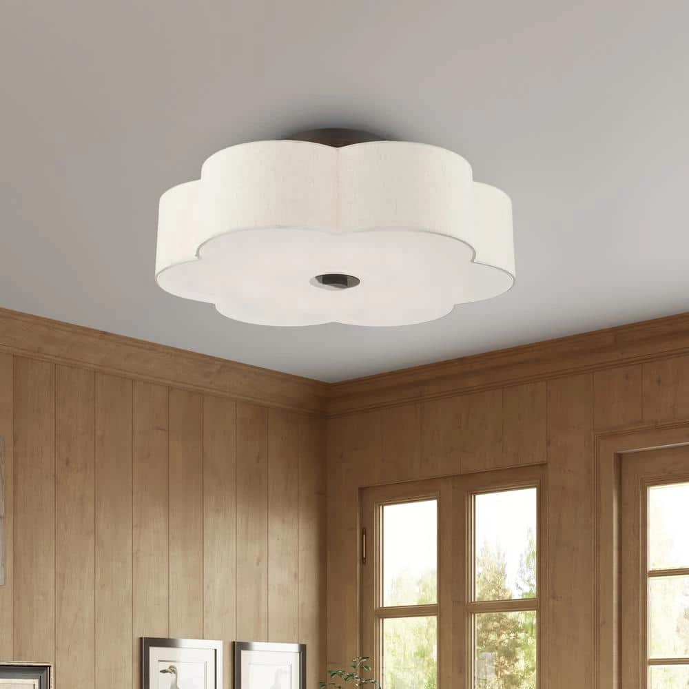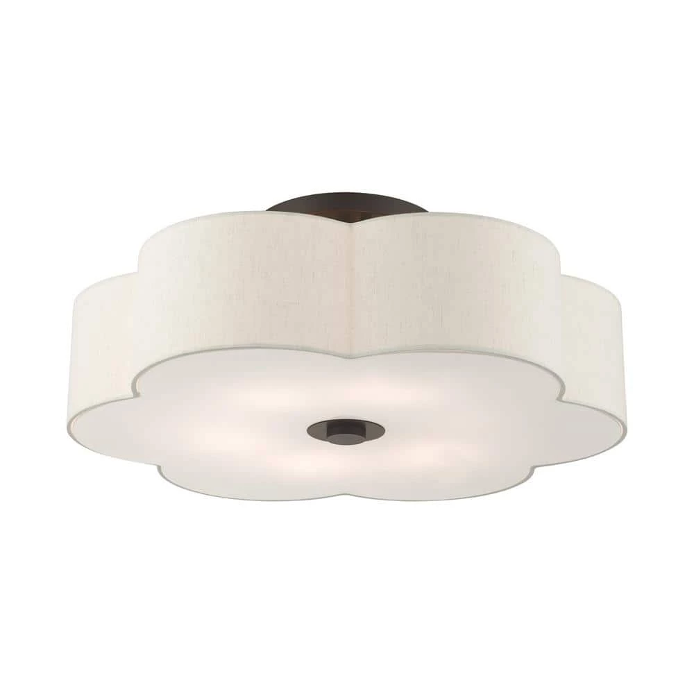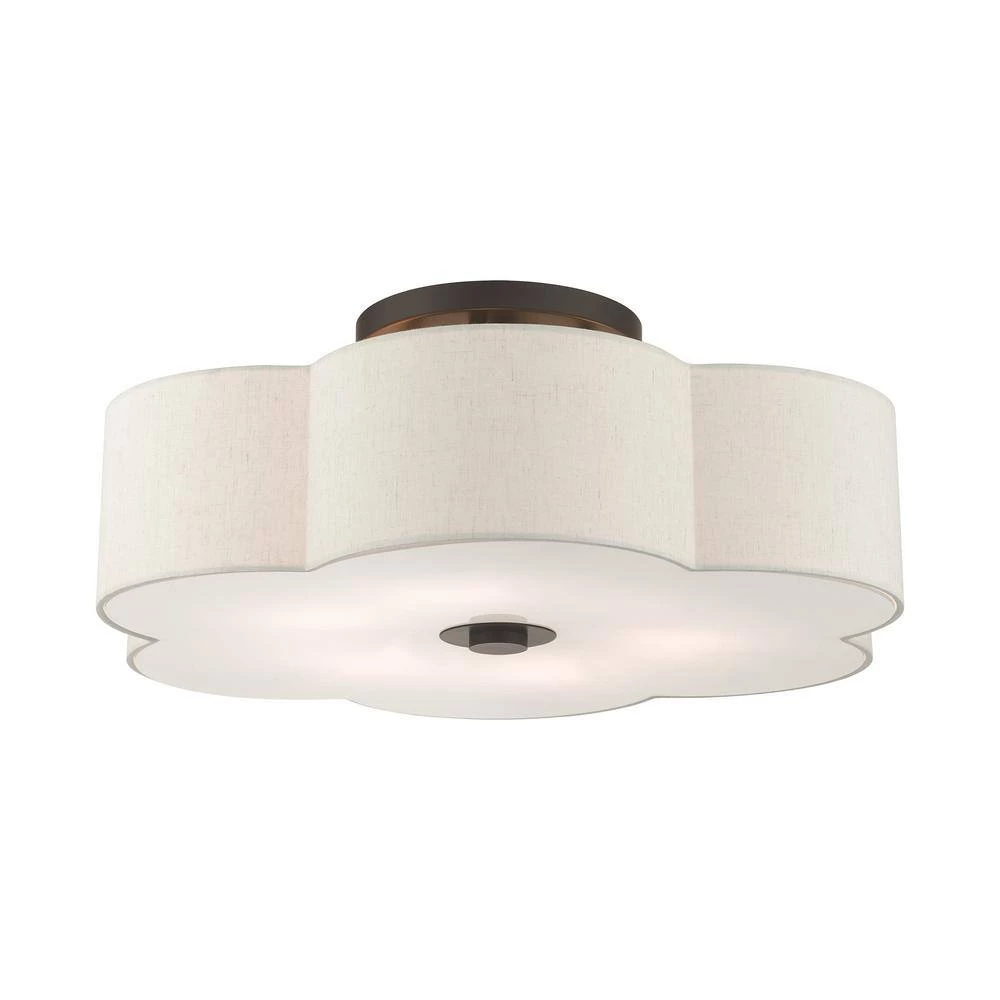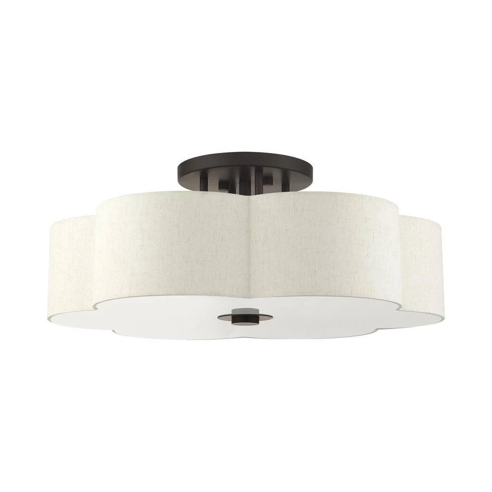 Livex Lighting is well known for quality, style and value. The Solstice series evokes a French country chic vibe. This extra-large six-light semi flush features a beautiful hand crafted scalloped shaped oatmeal colored hardback shade and is shown in an English bronze finish. Perfect finishing touch for a traditional, transitional or contemporary style interior. Enjoy this design in the living room, bedroom or dining room. This well-rounded fixture is sure to satisfy your lighting needs.