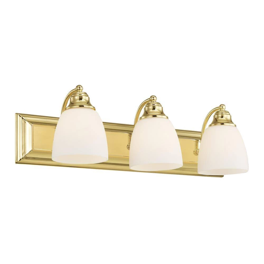 Livex Lighting is well known for quality, style and value. Bring a beautiful new look to your bathroom or vanity area with this charming 3 light bath fixture. A wide rectangular backplate in polished brass finish supports 3 simple arms that hold 3 glass shades in hand blown satin opal white glass. This well-rounded fixture is sure to satisfy your lighting needs.