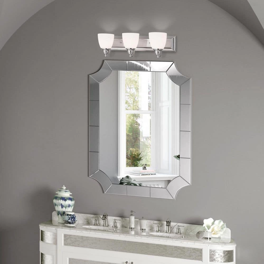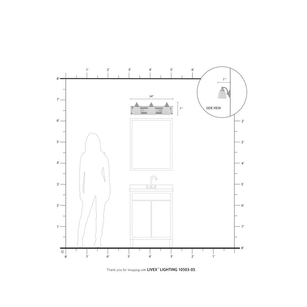 Livex Lighting is well known for quality, style and value. Bring a beautiful new look to your bathroom or vanity area with this charming 3 light bath fixture. A wide rectangular backplate in polished chrome finish supports 3 simple arms that hold 3 glass shades in hand blown satin opal white glass. This well-rounded fixture is sure to satisfy your lighting needs.