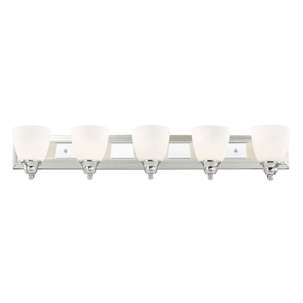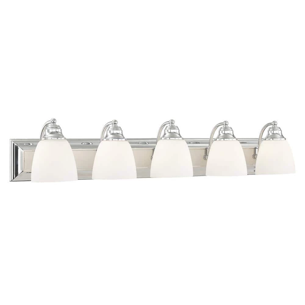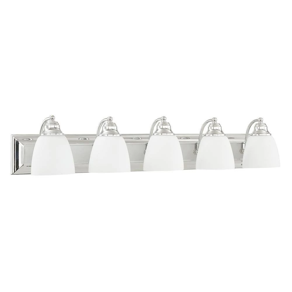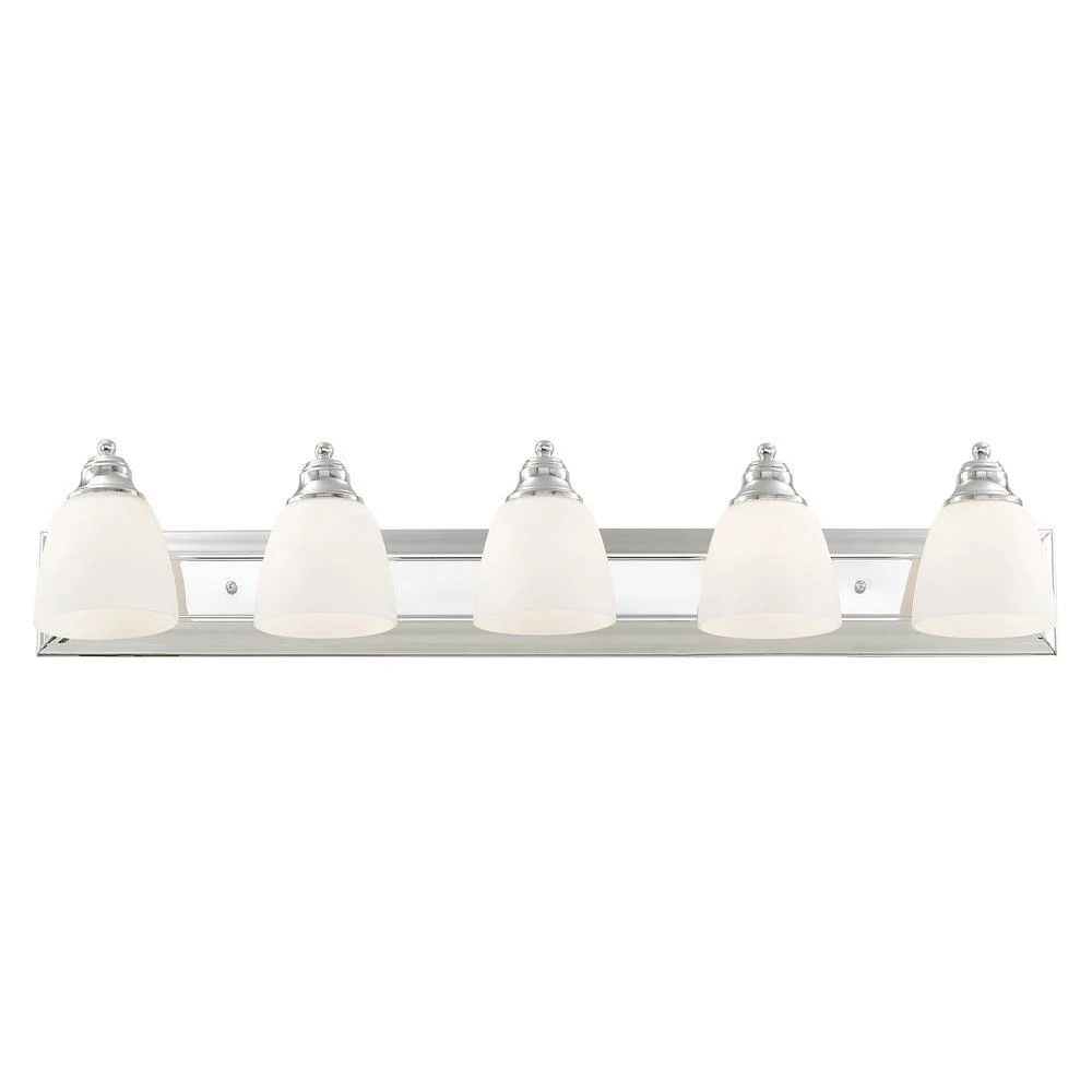 Livex Lighting is well known for quality, style and value. Bring a beautiful new look to your bathroom or vanity area with this charming 5 light bath fixture. A wide rectangular backplate in polished chrome finish supports 5 simple arms that hold 5 glass shades in hand blown satin opal white glass. This well-rounded fixture is sure to satisfy your lighting needs.