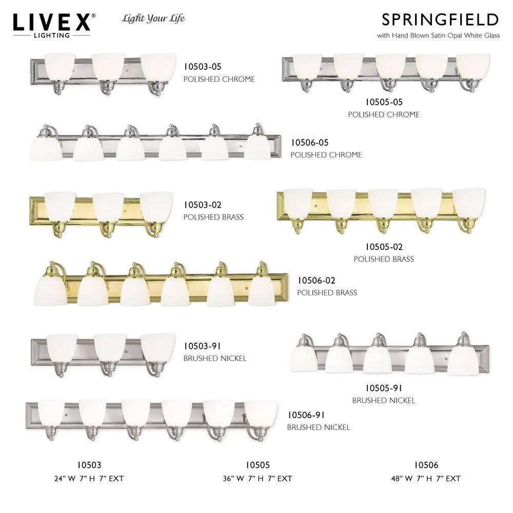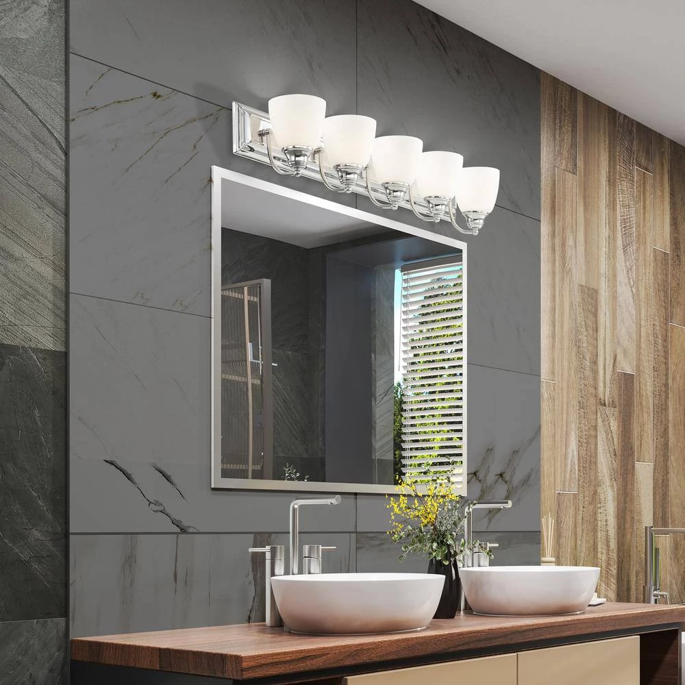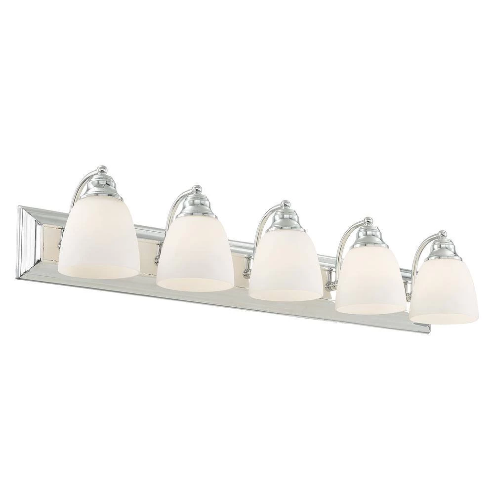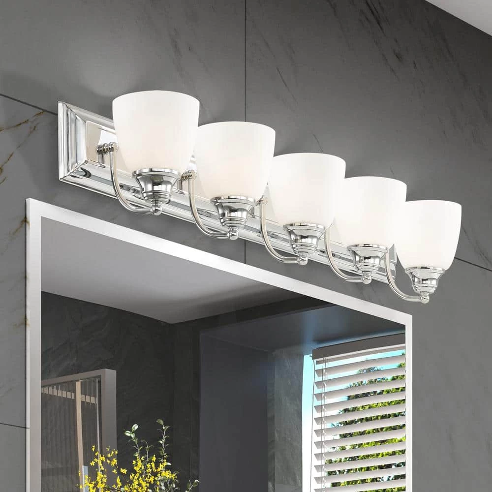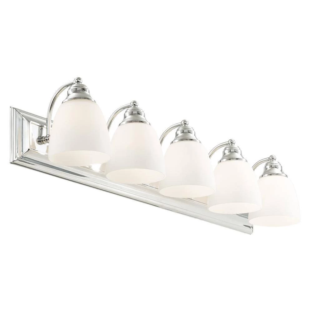 Livex Lighting is well known for quality, style and value. Bring a beautiful new look to your bathroom or vanity area with this charming 5 light bath fixture. A wide rectangular backplate in polished chrome finish supports 5 simple arms that hold 5 glass shades in hand blown satin opal white glass. This well-rounded fixture is sure to satisfy your lighting needs.