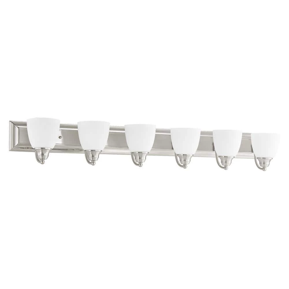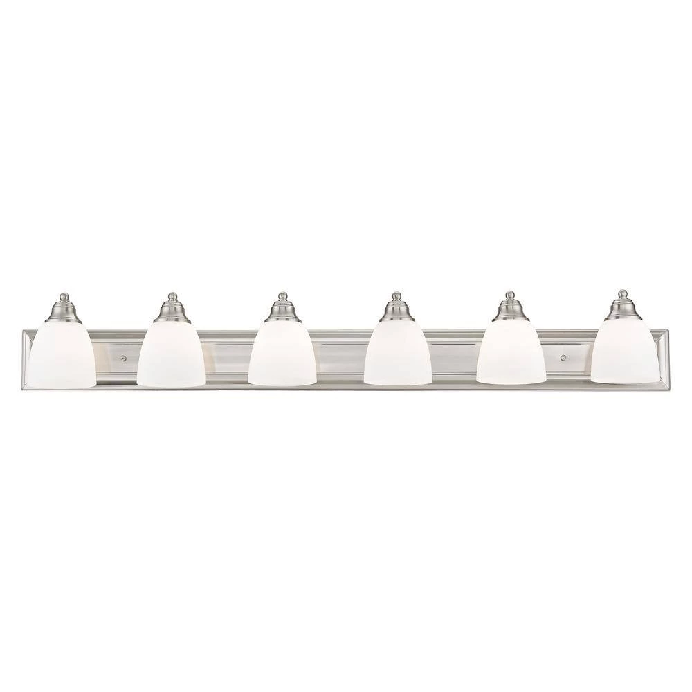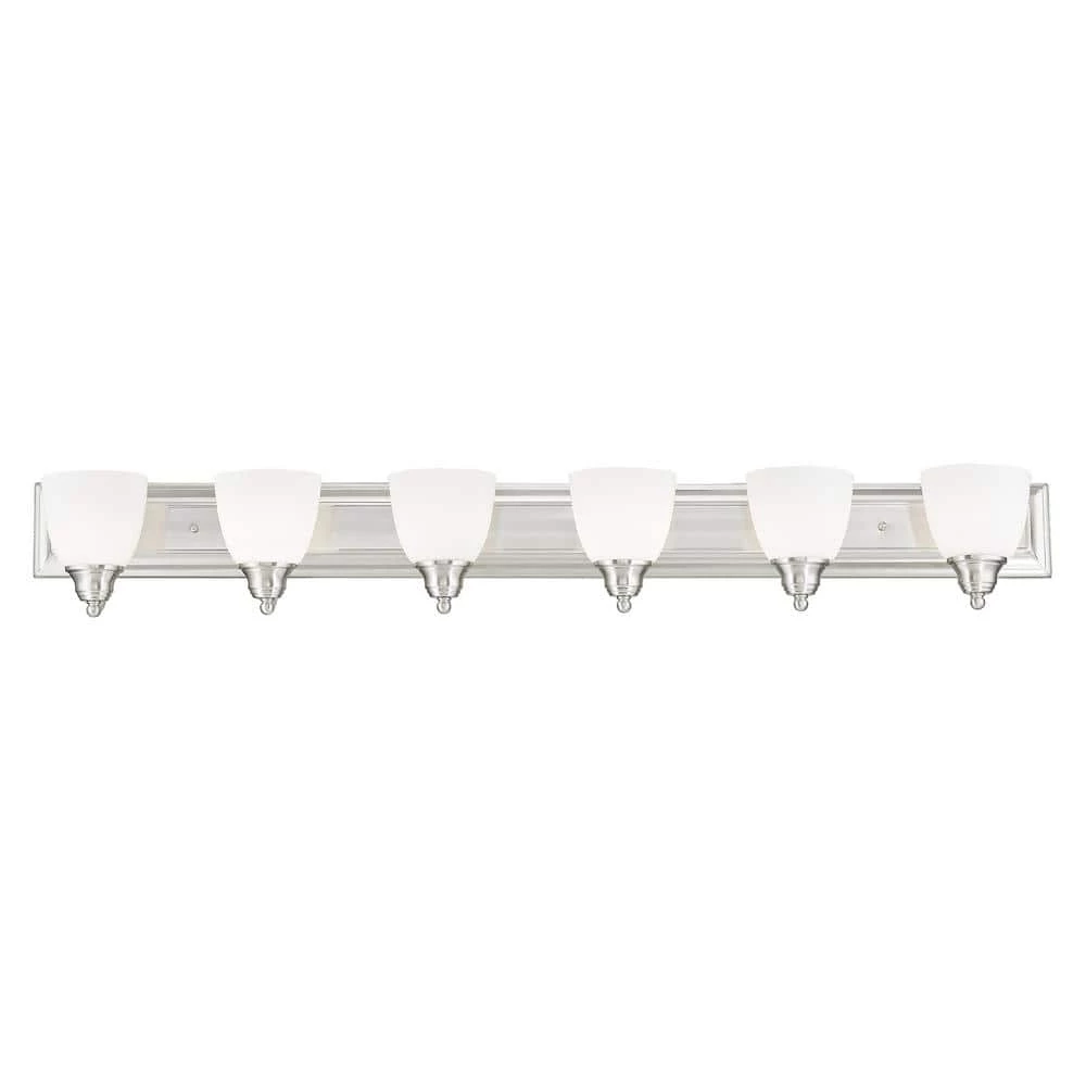 Livex Lighting is well known for quality, style and value. Bring a beautiful new look to your bathroom or vanity area with this charming 6 light bath fixture. A wide rectangular backplate in brushed nickel finish supports 6 simple arms that hold 6 glass shades in hand blown satin opal white glass. This well-rounded fixture is sure to satisfy your lighting needs.