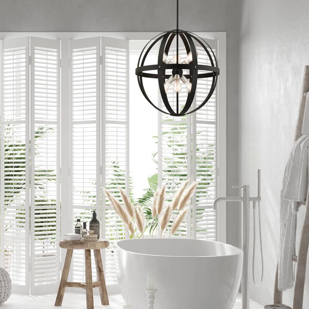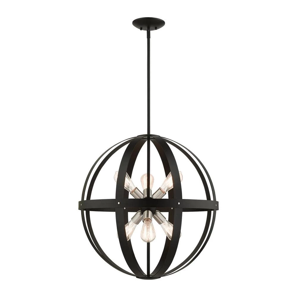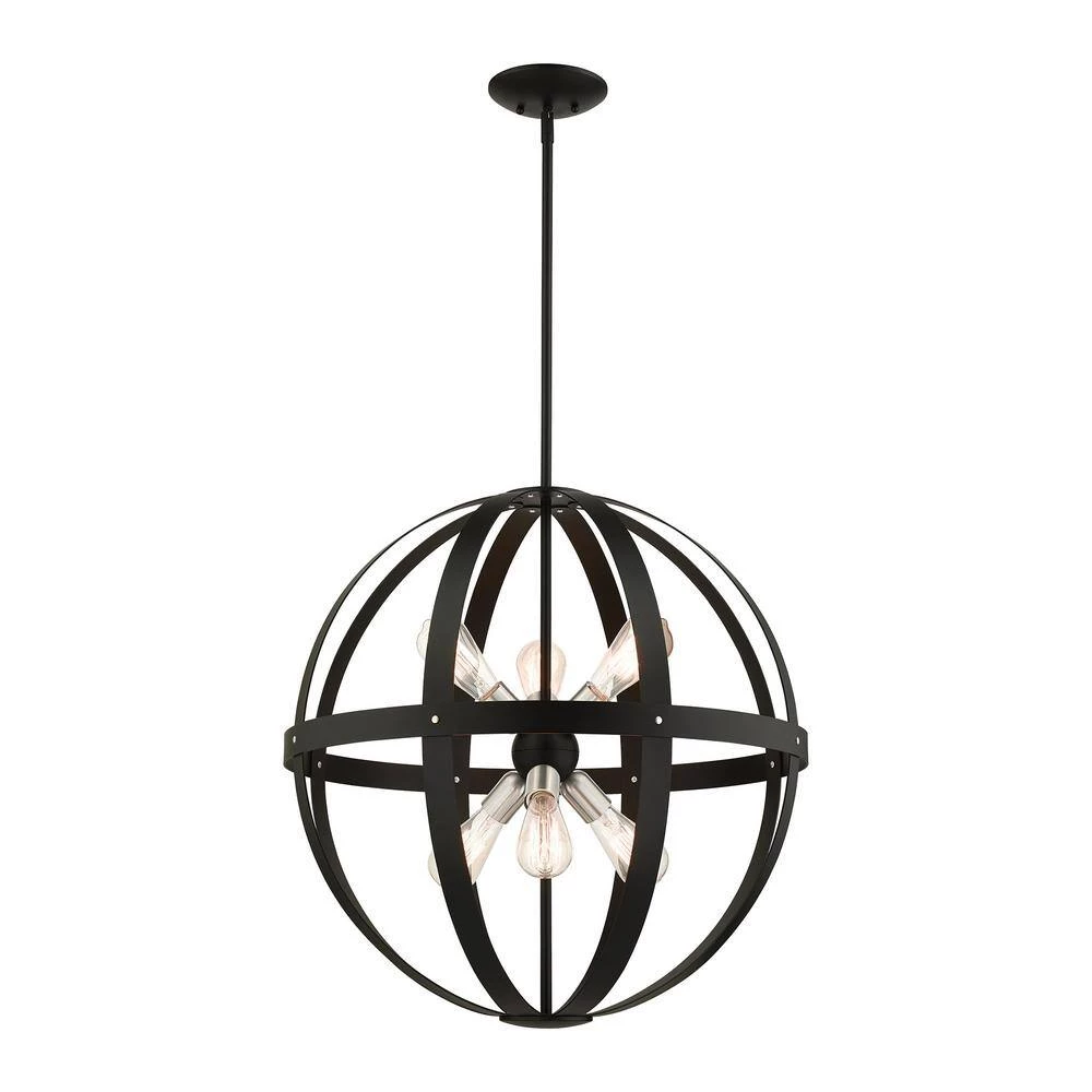 Livex Lighting is well known for quality, style and value. The Stoneridge collection hints at a casual rustic vibe. It features beautifully rounded steel straps held together by rivets. The cluster of lights are reminiscent of the sputnik design from the 50s and 60s mid-century modern era. This six-light globe pendant chandelier is shown in a textured black finish with brushed nickel accents. It will be a great feature in your modern loft or cabin as well as any transitional style interior. This well-rounded fixture is sure to satisfy your lighting needs.