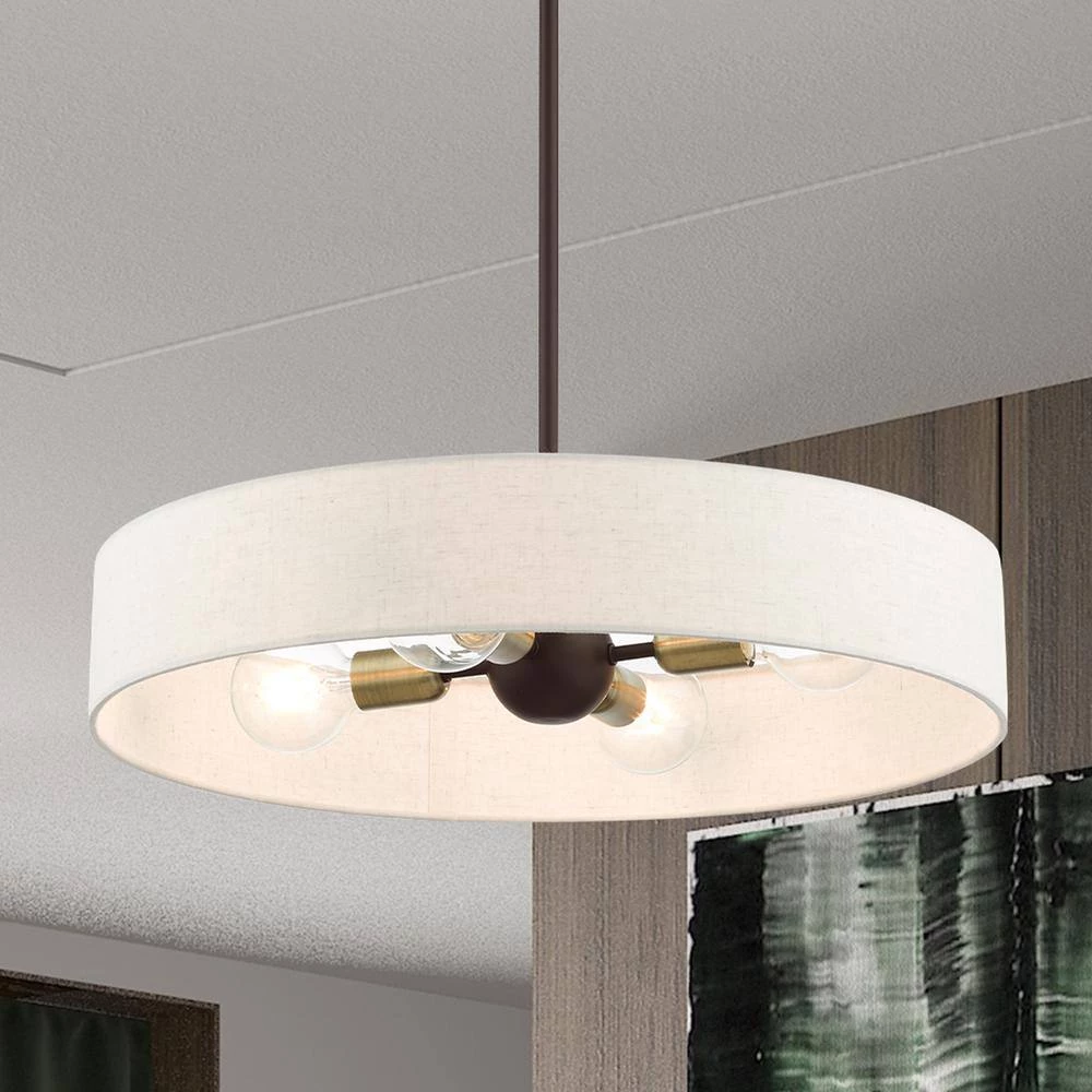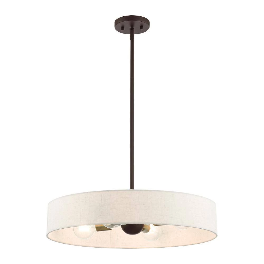 Livex Lighting is well known for quality, style and value. The Venlo collection is both modern and versatile. The bronze finish with antique brass finish accents and hand-crafted oatmeal colored fabric hardback shade sets a pleasant mood. This sleek medium 4-light drum pendant is a perfect fit for the living room, dining room, kitchen and bedroom. This well-rounded fixture is sure to satisfy your lighting needs.