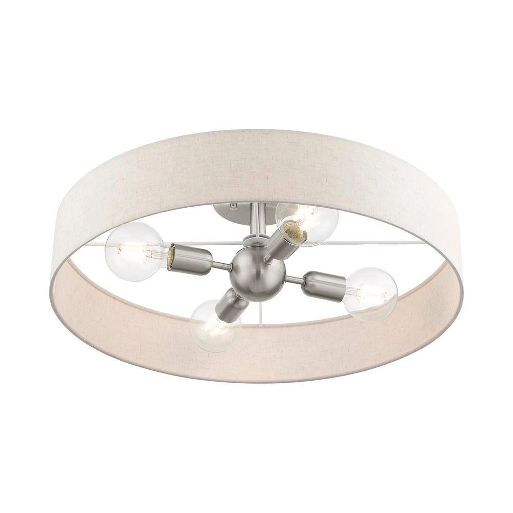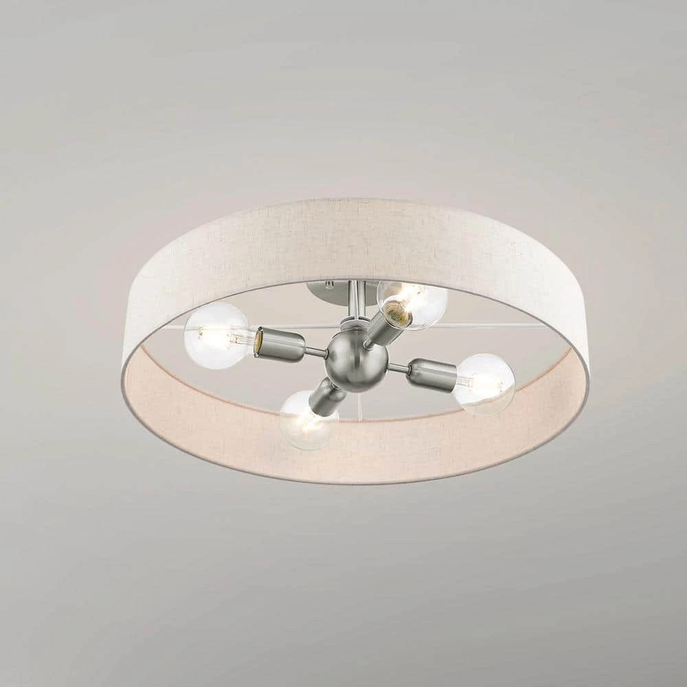 Livex Lighting is well known for quality, style and value. The Venlo collection is both modern and versatile. The brushed nickel finish and hand-crafted oatmeal colored fabric hardback shade sets a pleasant mood. This sleek large 4-light drum semi-flush is a perfect fit for the living room, dining room, kitchen and bedroom. This well-rounded fixture is sure to satisfy your lighting needs.