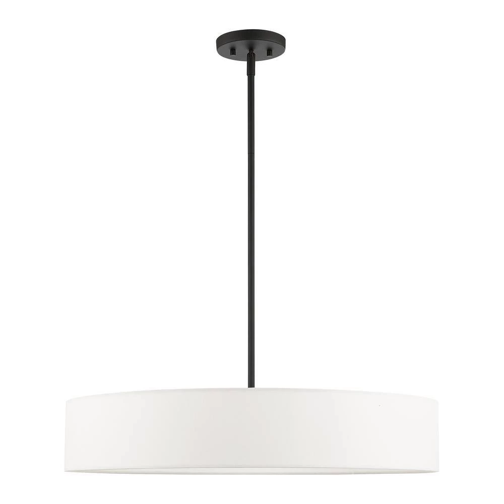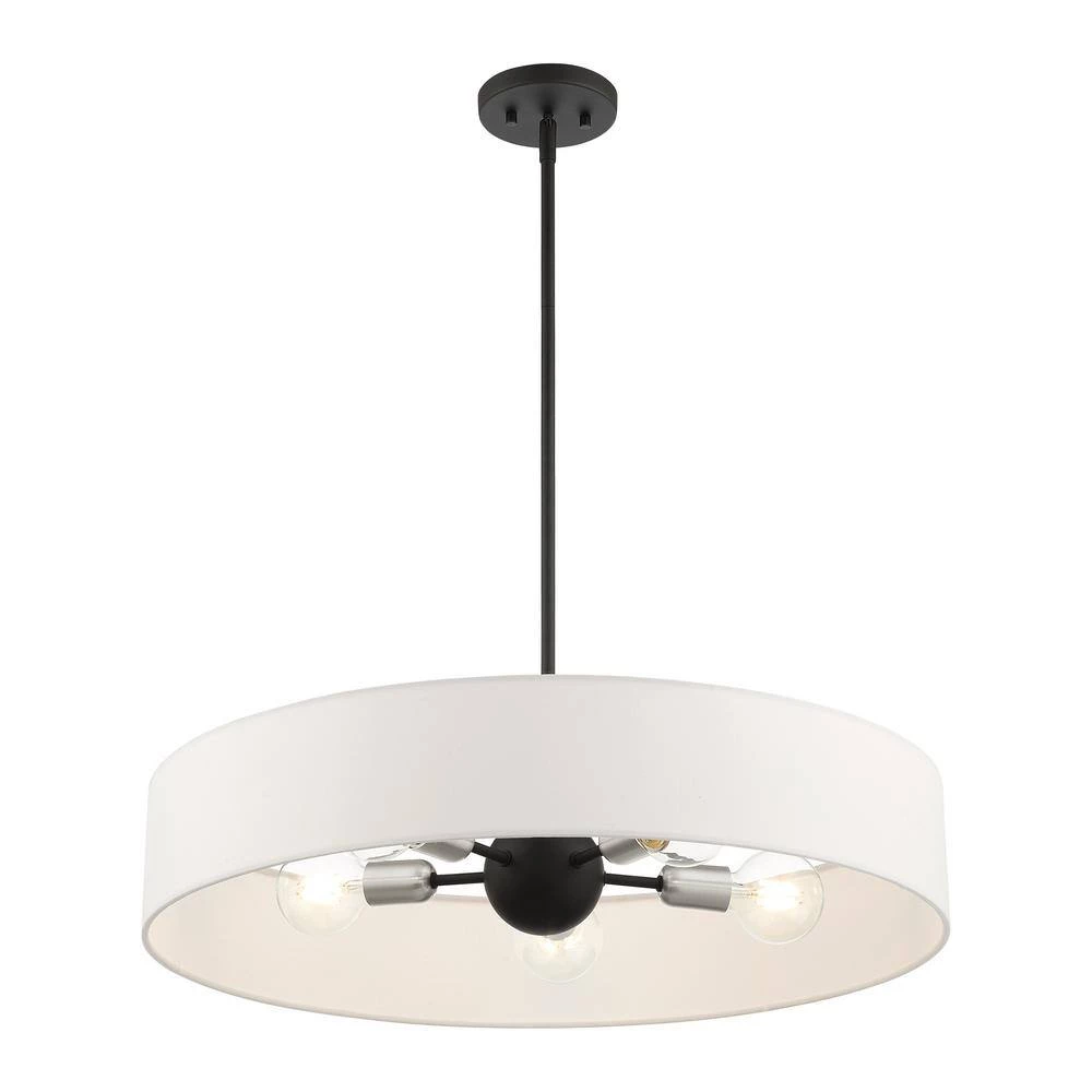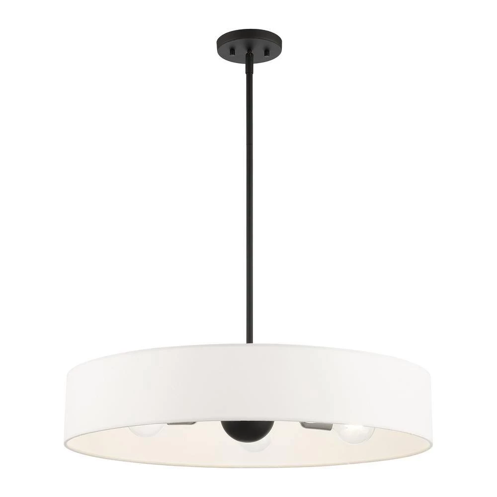 Livex Lighting is well known for quality, style and value. The Venlo collection is both modern and versatile. The black finish with brushed nickel finish accents and hand-crafted off-white colored fabric hardback shade sets a pleasant mood. This sleek large 5-light drum pendant is a perfect fit for the living room, dining room, kitchen and bedroom. This well-rounded fixture is sure to satisfy your lighting needs.