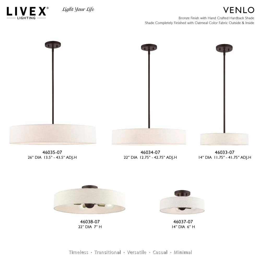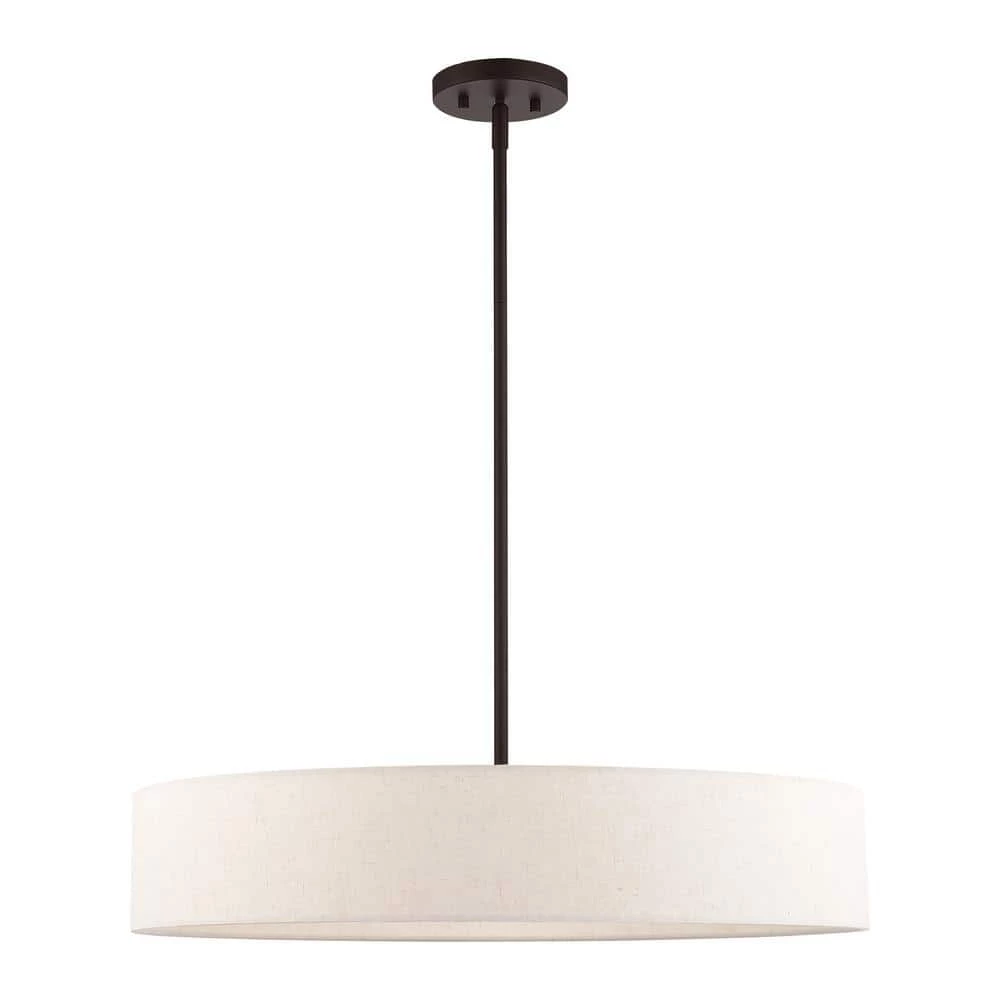 Livex Lighting is well known for quality, style and value. The Venlo collection is both modern and versatile. The bronze finish with antique brass finish accents and hand-crafted oatmeal colored fabric hardback shade sets a pleasant mood. This sleek large 5-light drum pendant is a perfect fit for the living room, dining room, kitchen and bedroom. This well-rounded fixture is sure to satisfy your lighting needs.
