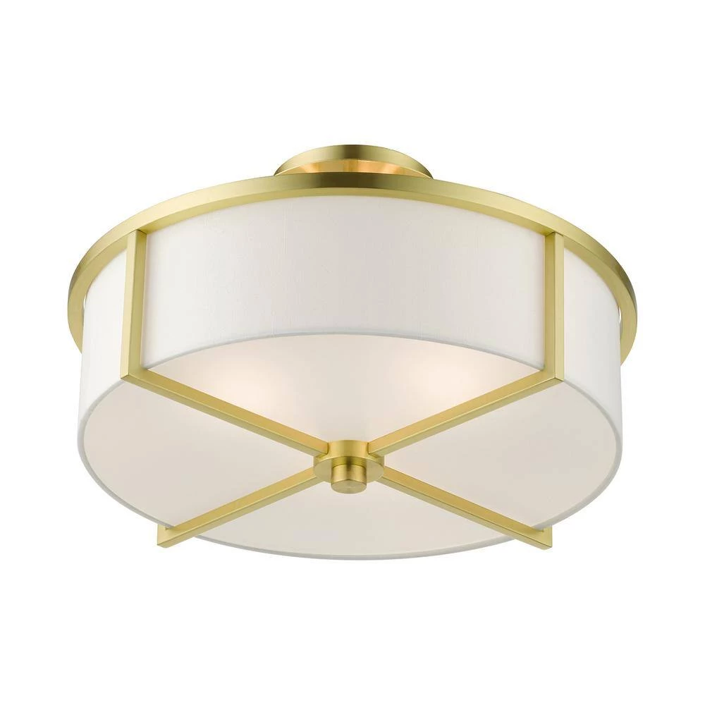 This large satin brass 3-light semi flush fixture from the Wesley Collection features an off-white hardback fabric shade. Practical illumination, timeless charm and versatility make this ceiling mount the right choice for any room of your house. With its easy installation and low upkeep requirements, this charming piece will not disappoint.