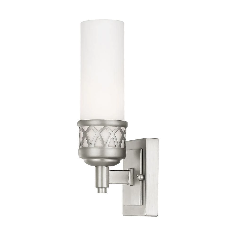 Featuring a smooth cylindrical hand blown satin opal white glass shade for a discerning touch, this contemporary bath fixture features a round framing and classic squared backplate. Finished in an on-trend brushed nickel hue, it’s a definitive look for contemporary and classic looks alike. This well-rounded wall light is sure to satisfy your indoor lighting needs.