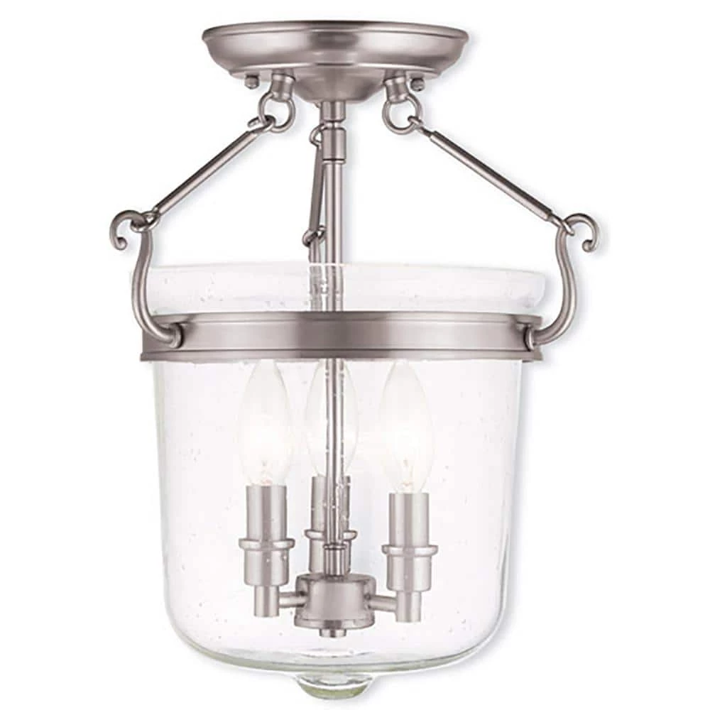 Livex Lighting is well known for quality, style and value. A hand crafted seeded glass holds 3 candelabra bulbs in this wonderful semi flush mount bell jar lantern. Brushed nickel finish adorns the hardware and round canopy. This well-rounded fixture is sure to satisfy your lighting needs.